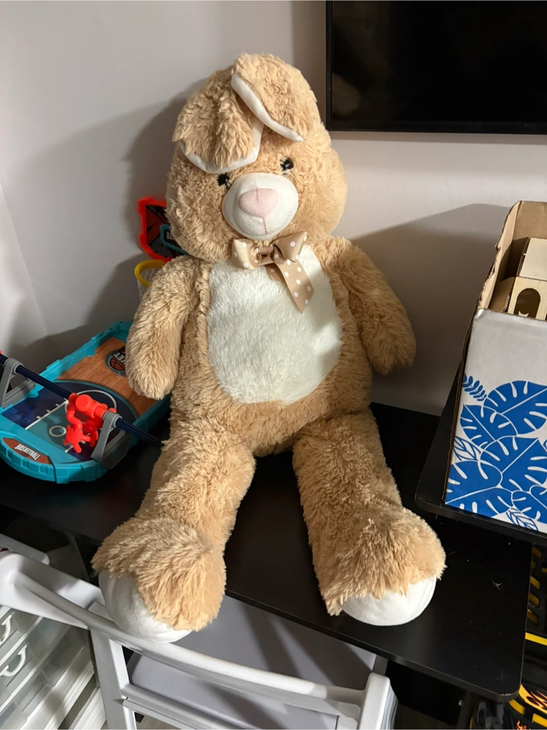 This is a large, soft plush bunny toy. It's a light brown colour with a white belly and a polka dot bow. It's a cuddly size for a child.