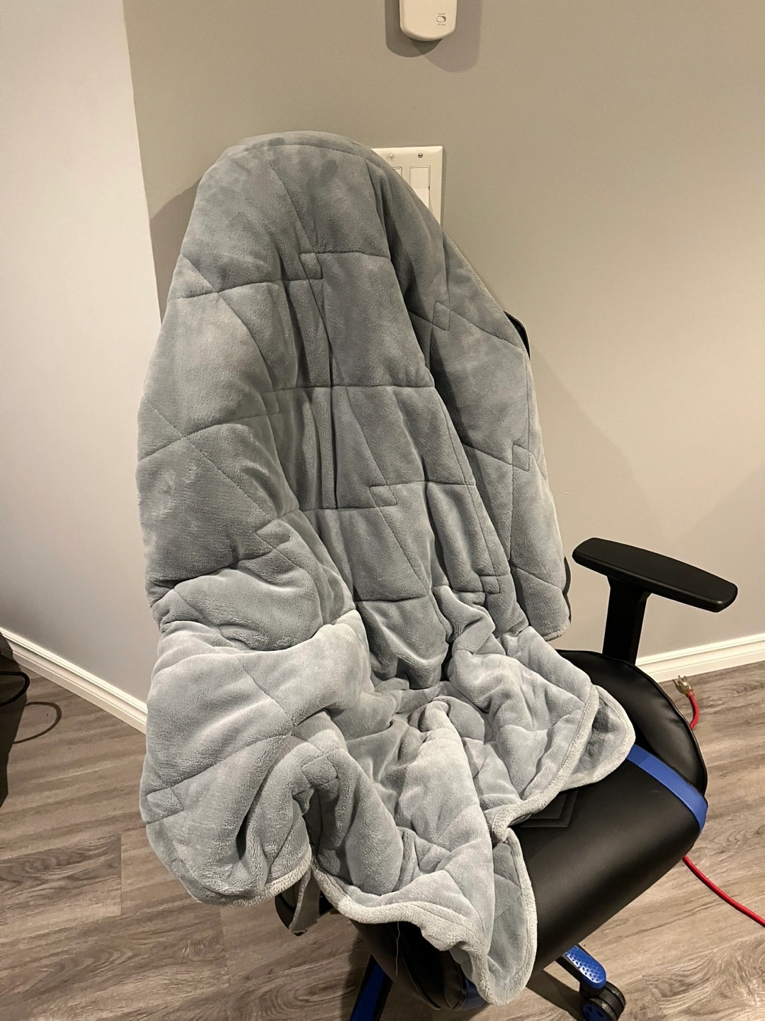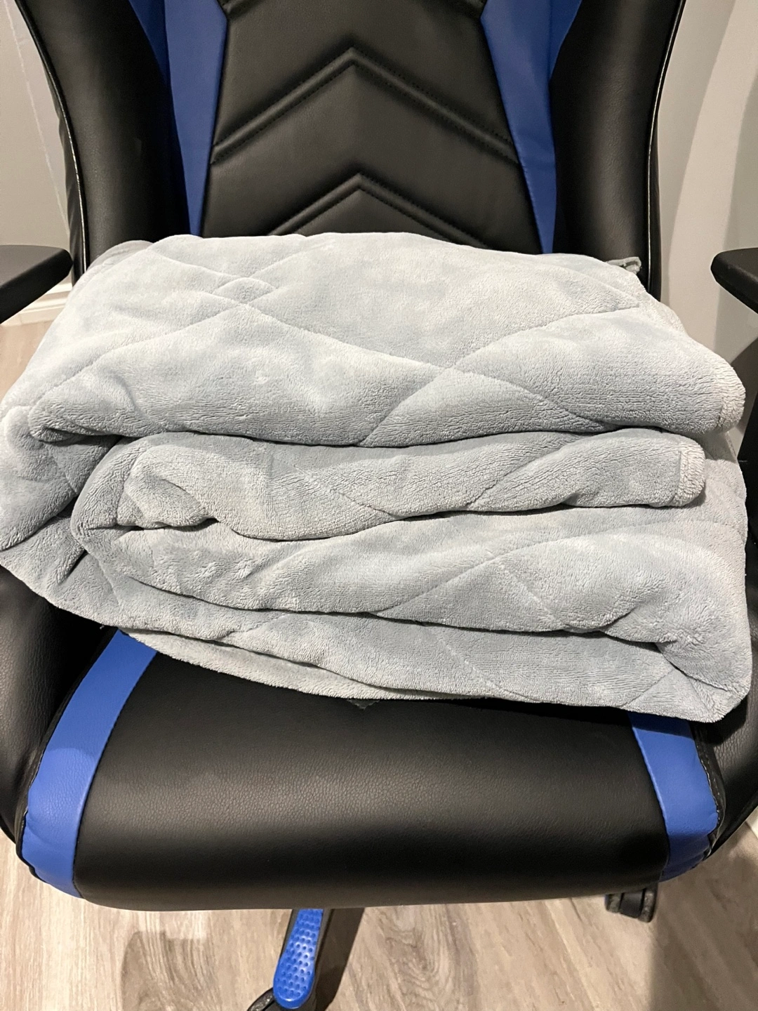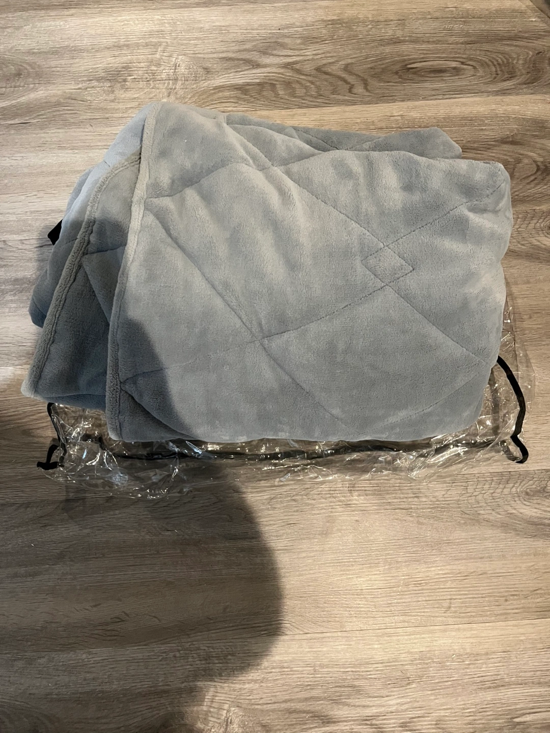Selling a cozy gray weighted blanket! It's in great condition and perfect for relaxing. It has a nice quilted pattern and is ready to help you unwind after a long day