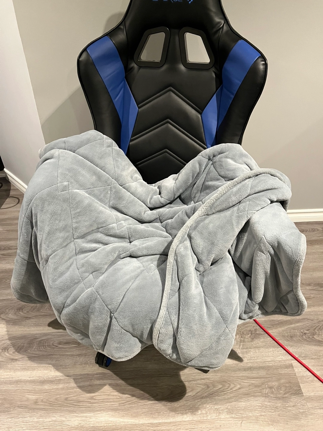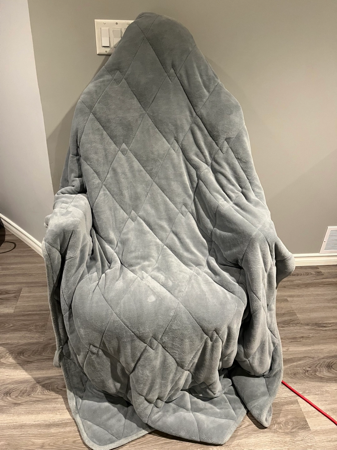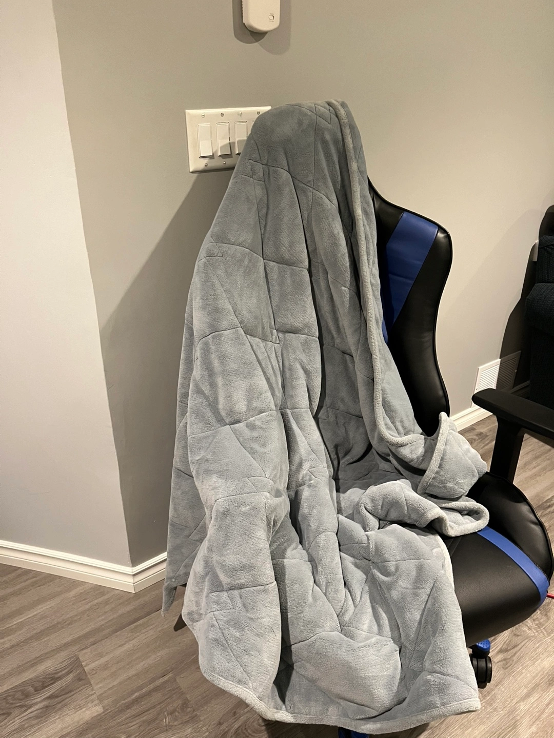 Selling a cozy gray weighted blanket! It's in great condition and perfect for relaxing. It has a nice quilted pattern and is ready to help you unwind after a long day