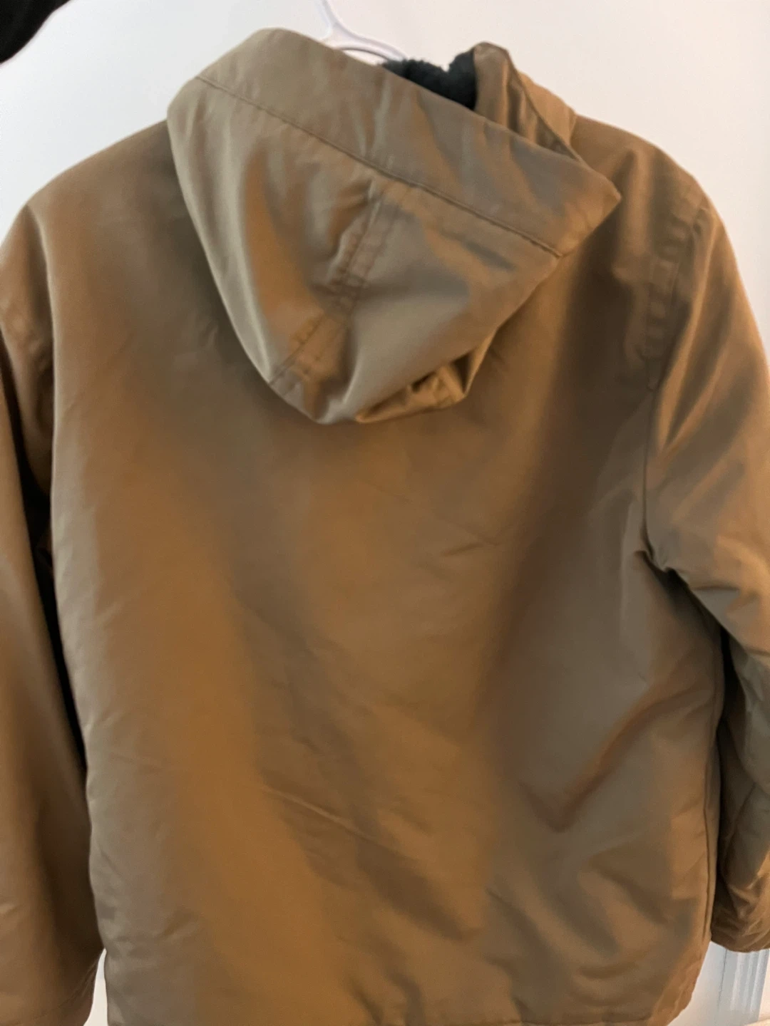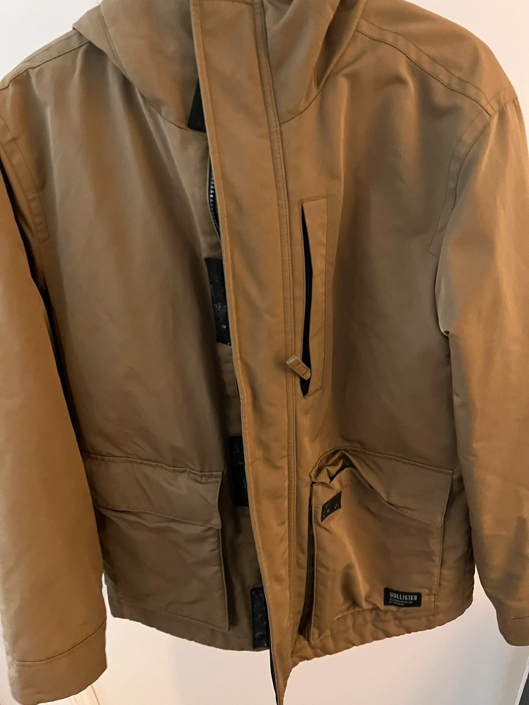 Warm hooded parka jacket from Hollister. It's a nice brown colour with a faux fur lined hood. Includes two front pockets and a zippered chest pocket. Size S