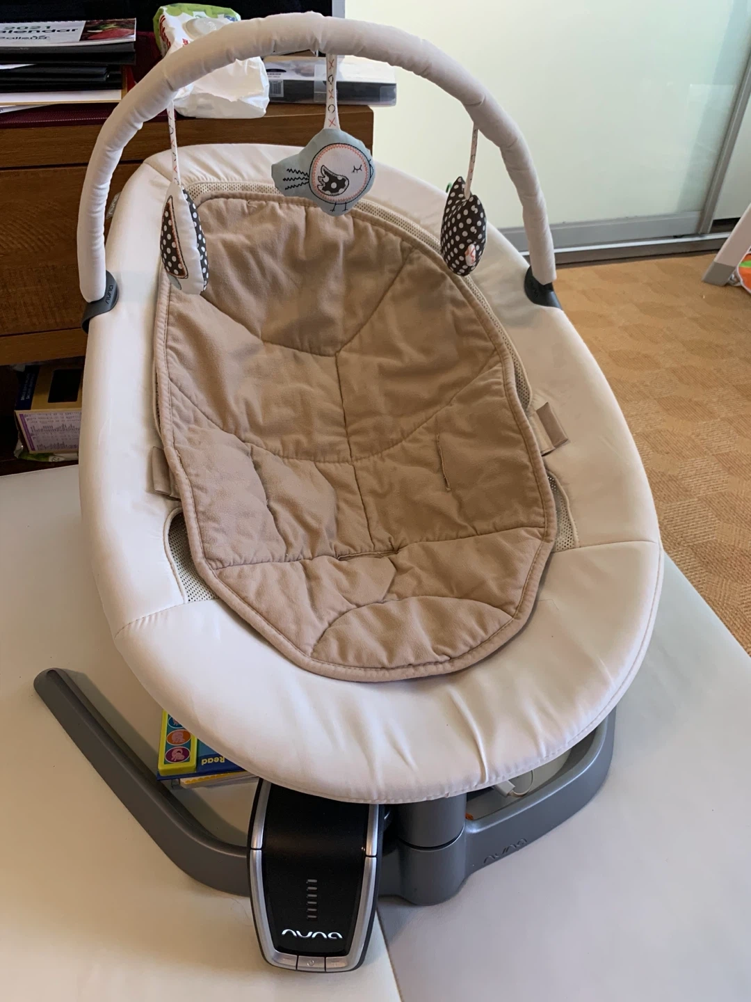 This Nuna Leaf baby Swing is a great choice for soothing your little one. It's designed with a comfortable seat and a gentle rocking motion. The neutral beige and white colour scheme fits well with most nursery decor.
