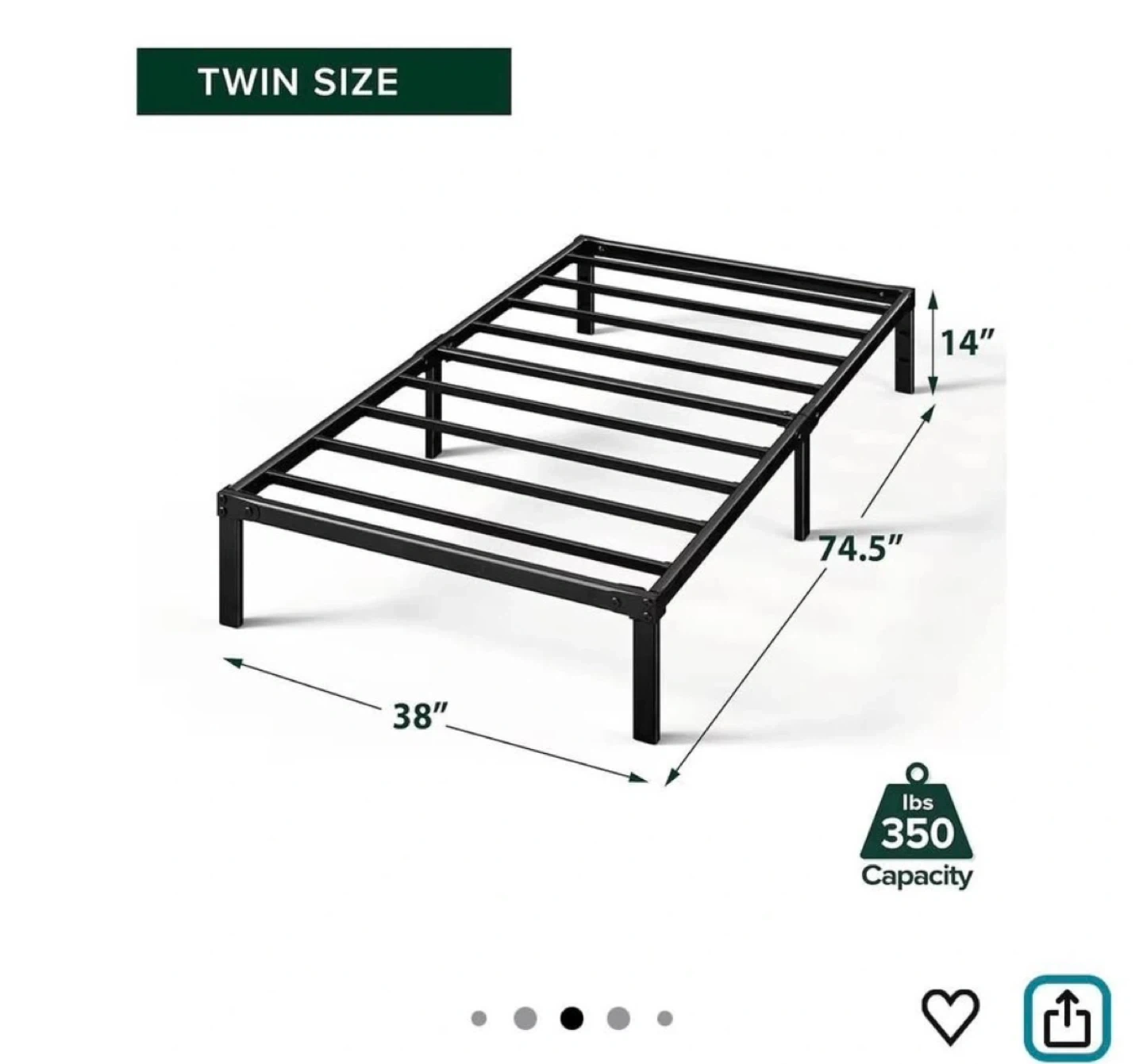 Includes a Zinus twin bed frame (14 inch high). Bed frame dimensions: 189.2L x 96.5W x 35.6H cm. Feel free to message if you have any questions!