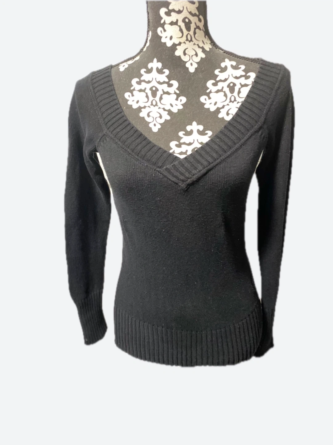 A simple black long-sleeve sweater with a V-neck cut. Perfect for layering or wearing on its own!