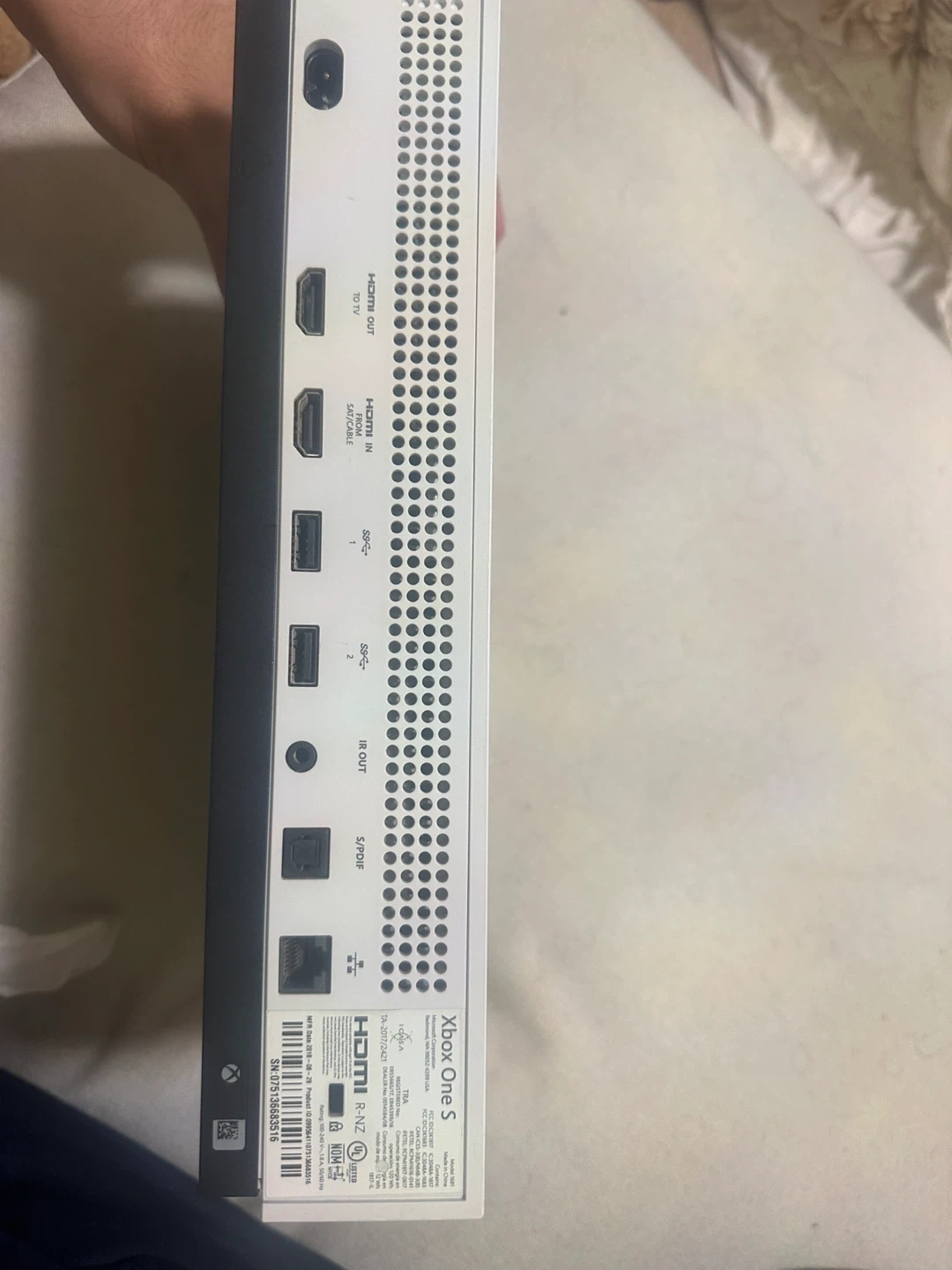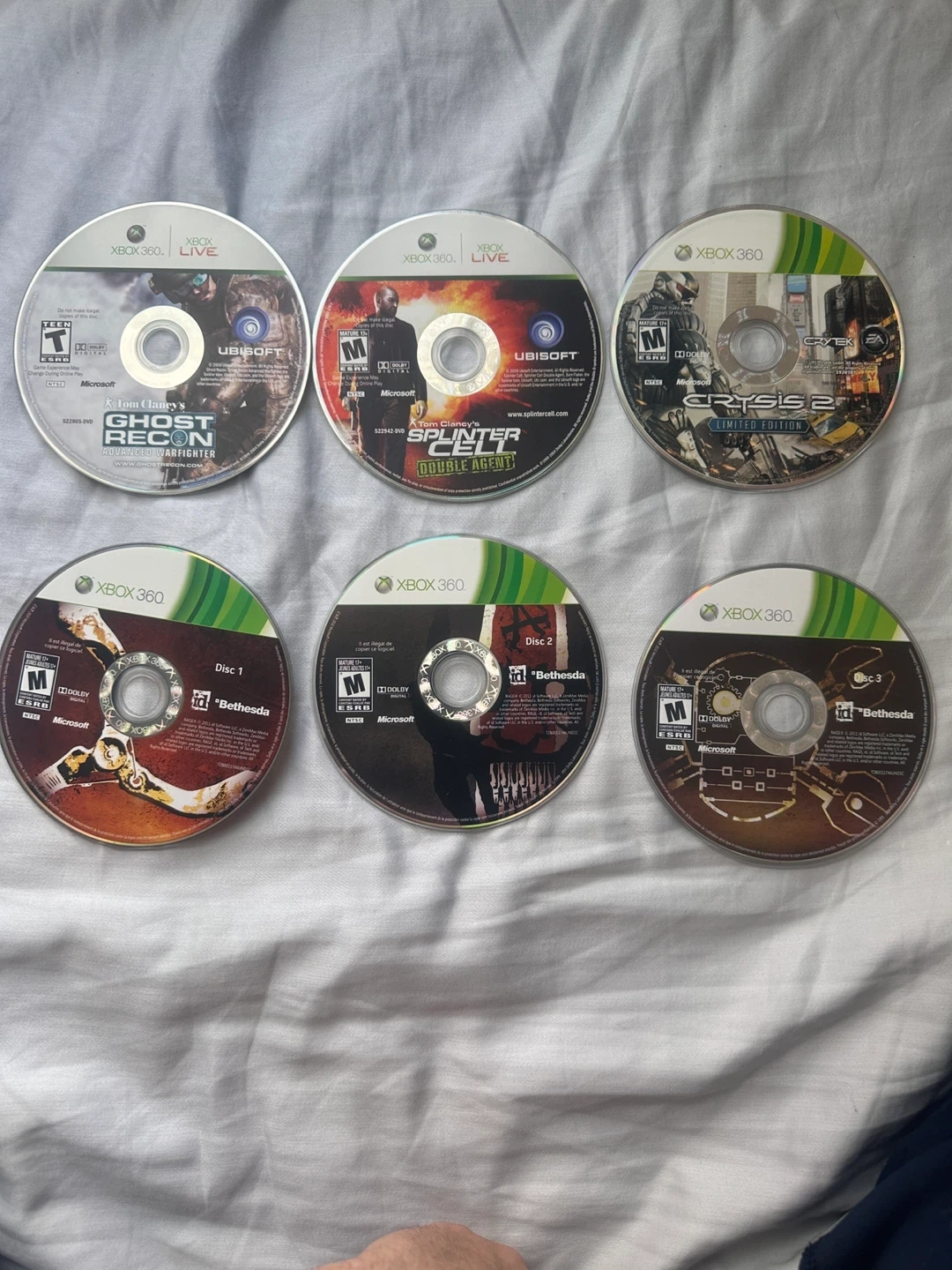 Two white Xbox One controllers and a collection of games for Xbox One and Xbox 360. Includes NHL 17, Watch Dogs, Battlefield 4, 2K23, and Metal Gear Solid V for Xbox One. Also includes Far Cry 3, Fallout 3, Assassin's Creed: Black Flag, Splinter Cell: Blacklist, Battlefield 3, Call of Duty 2, and Ghost Recon: Advanced Fighter 2 for Xbox 360. Also includes Kinect Adventures for Xbox 360.