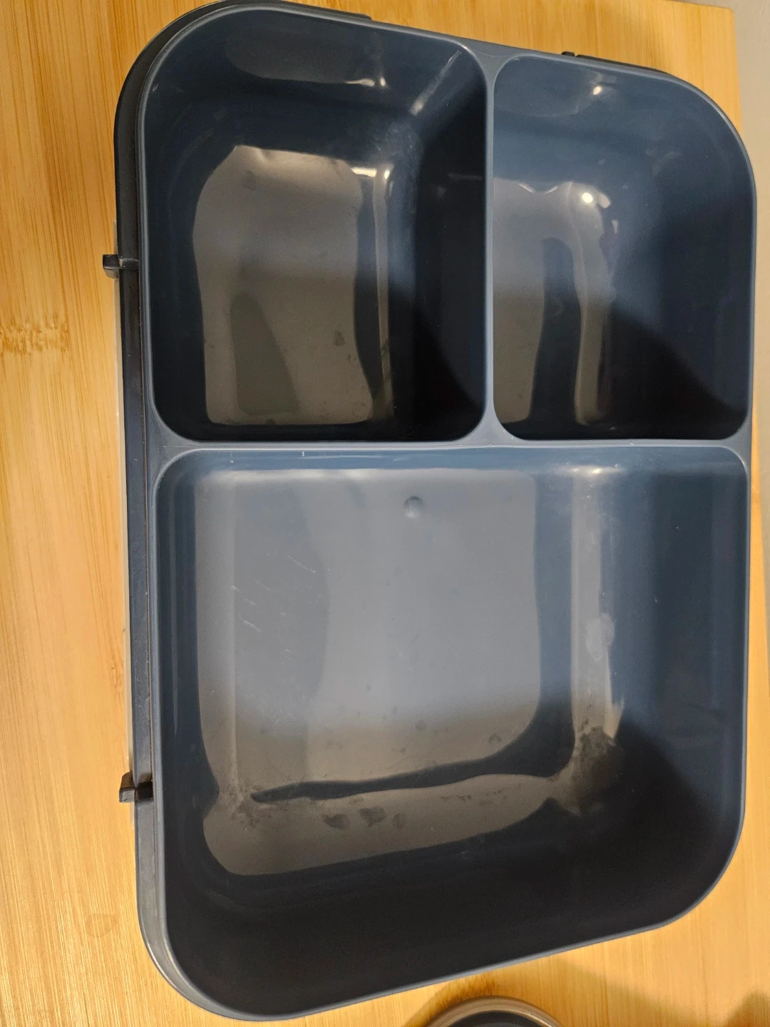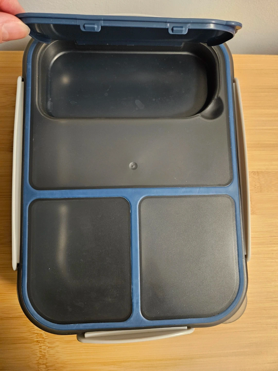 This is a blue and grey compartmentalized bento lunch box by Russbe. It features a main compartment and two smaller compartments for snacks or sides. The lid secures tightly with latches for easy transport.