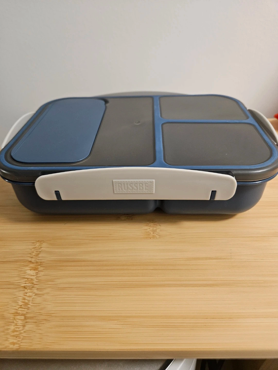 This is a blue and grey compartmentalized bento lunch box by Russbe. It features a main compartment and two smaller compartments for snacks or sides. The lid secures tightly with latches for easy transport.