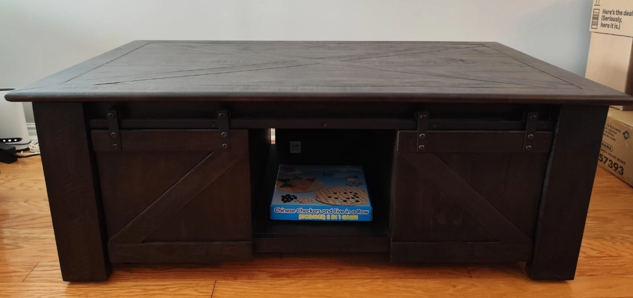Farmhouse Coffee Table with Sliding Barn Doors + Lift-Top Storag