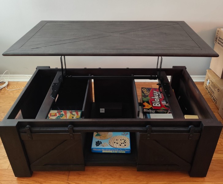 It features sliding barn doors on both sides and a lift-top mechanism that allows you to use it as a workspace or dining surface. The table also offers very large internal storage.