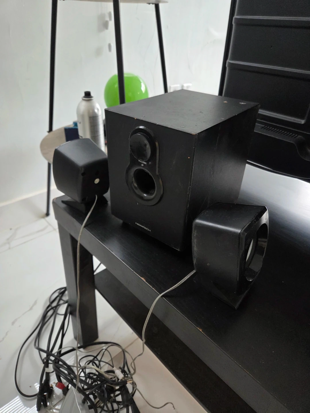This is a Noxtech 2.1 computer speaker system. It includes a subwoofer and two satellite speakers. The subwoofer has a volume dial on the front. All cables are included.