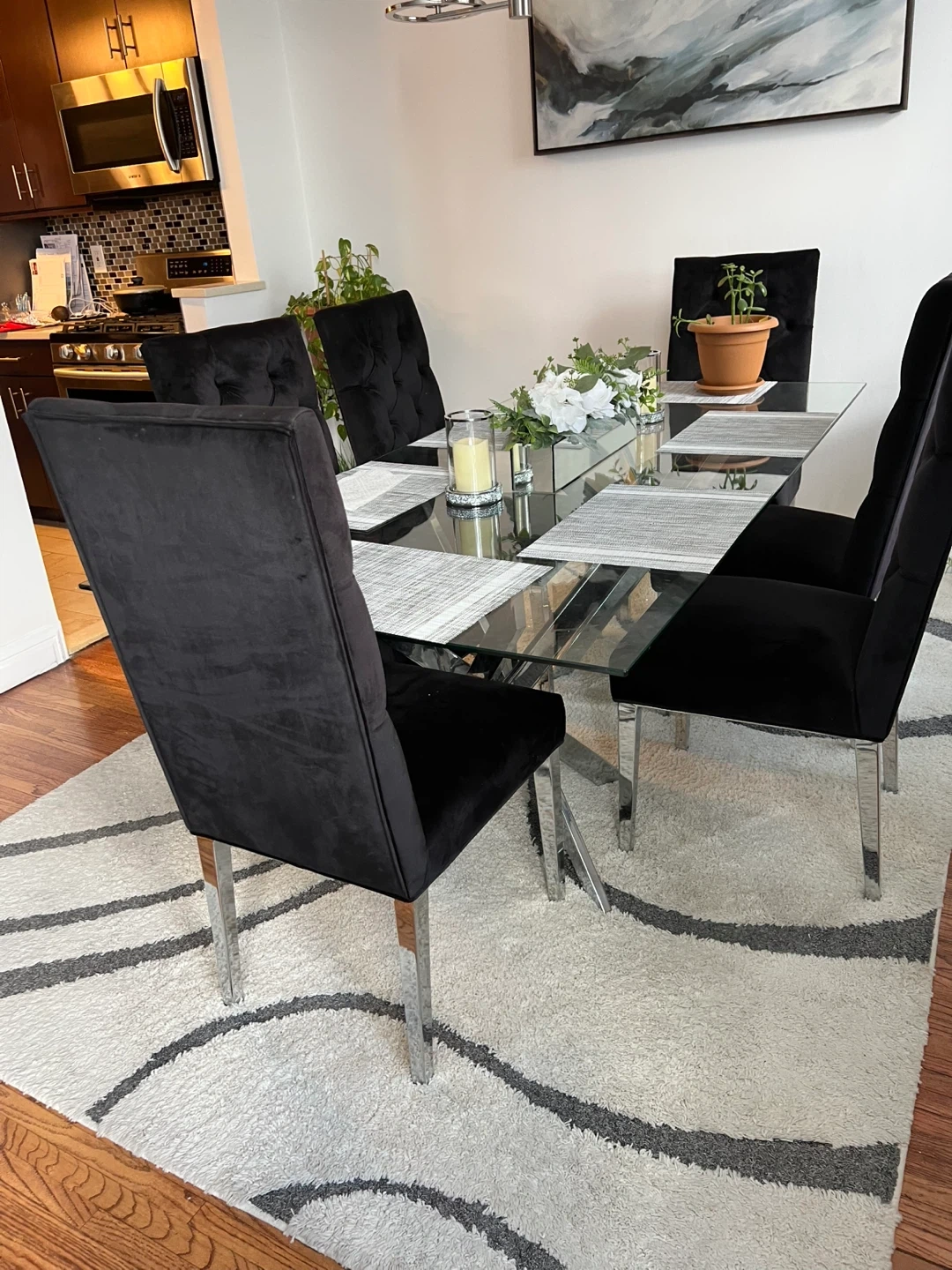 Glass top dining table with a chrome X-leg base. 6 black velvet dining chairs with chrome legs included. Seats six people comfortably.
