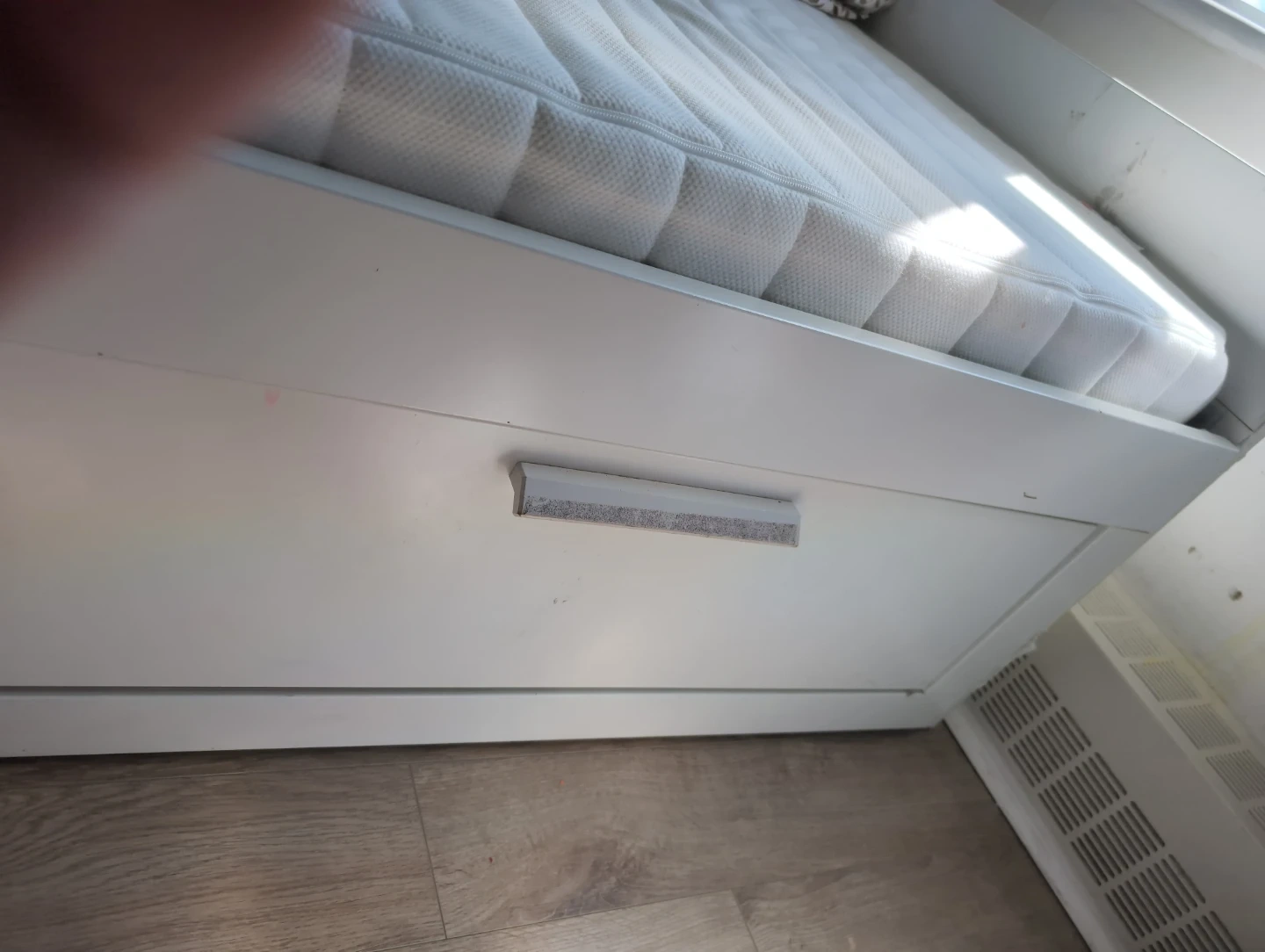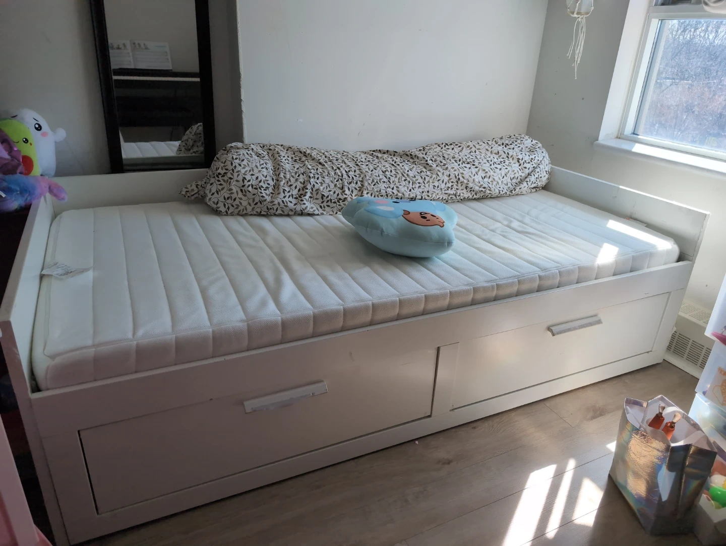 White twin daybed with two large storage drawers. This versatile piece is perfect for a bedroom or guest room. It offers convenient storage and a comfortable place to rest. The frame is made of sturdy material.