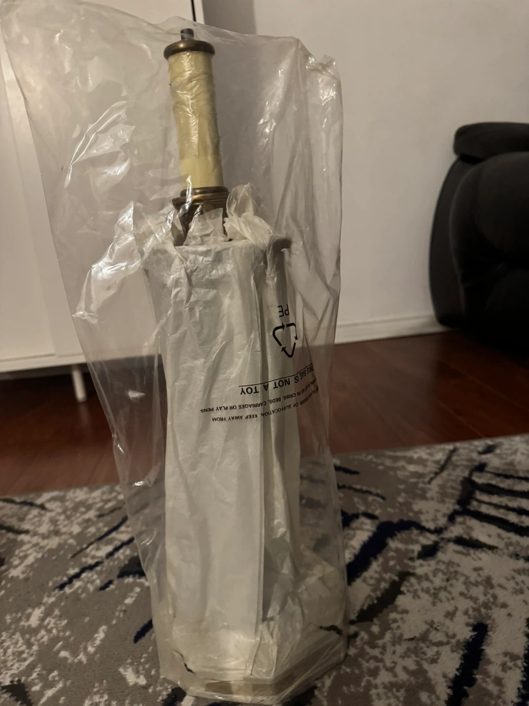 This elegant table lamp features a decorative brass base with black accents. It has a classic candlestick-style light socket. Adds a touch of vintage charm to any room!