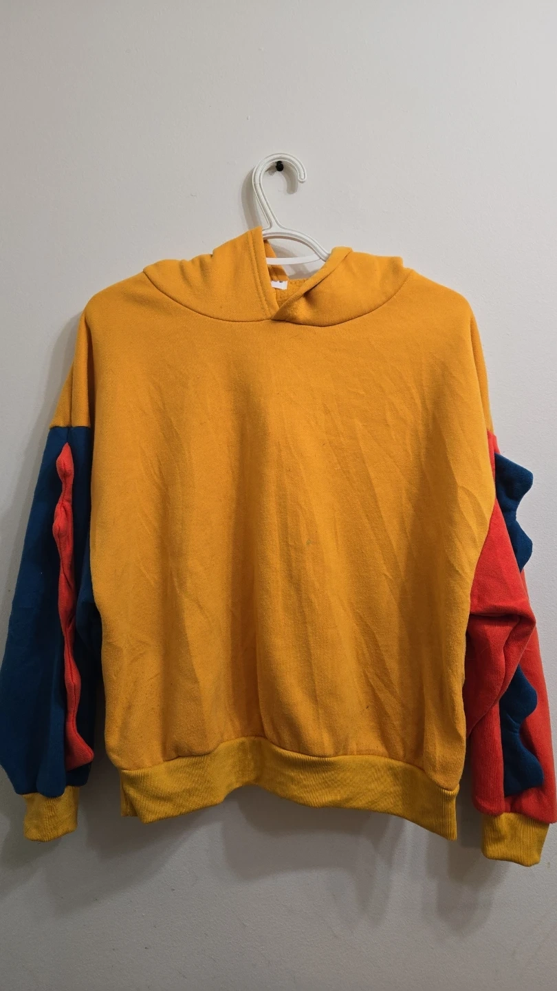 This kids' hoodie features a fun colour block design with red and blue sleeves. It has a yellow body and a blue dinosaur tail and spikes down the back. Great for a playful addition to any kid's wardrobe!
