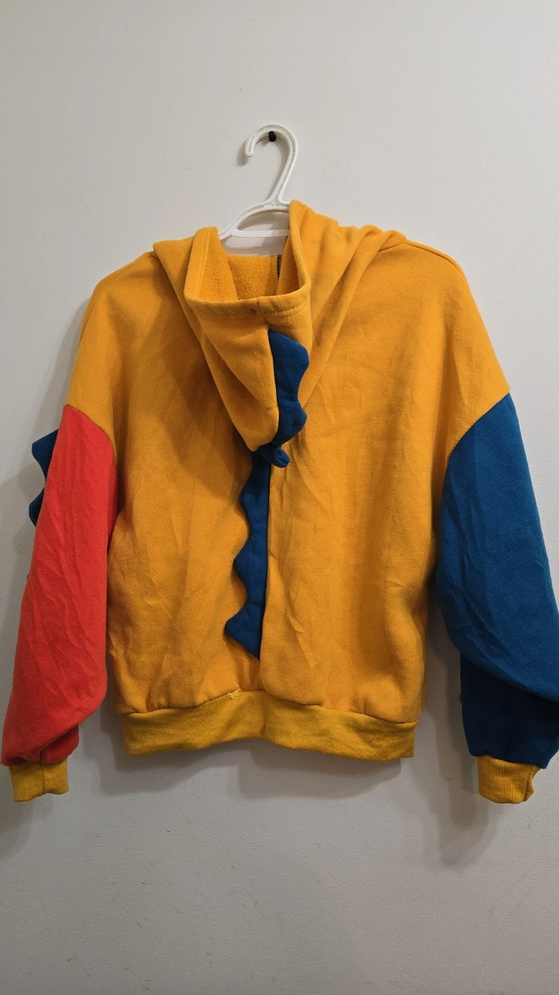 This kids' hoodie features a fun colour block design with red and blue sleeves. It has a yellow body and a blue dinosaur tail and spikes down the back. Great for a playful addition to any kid's wardrobe!