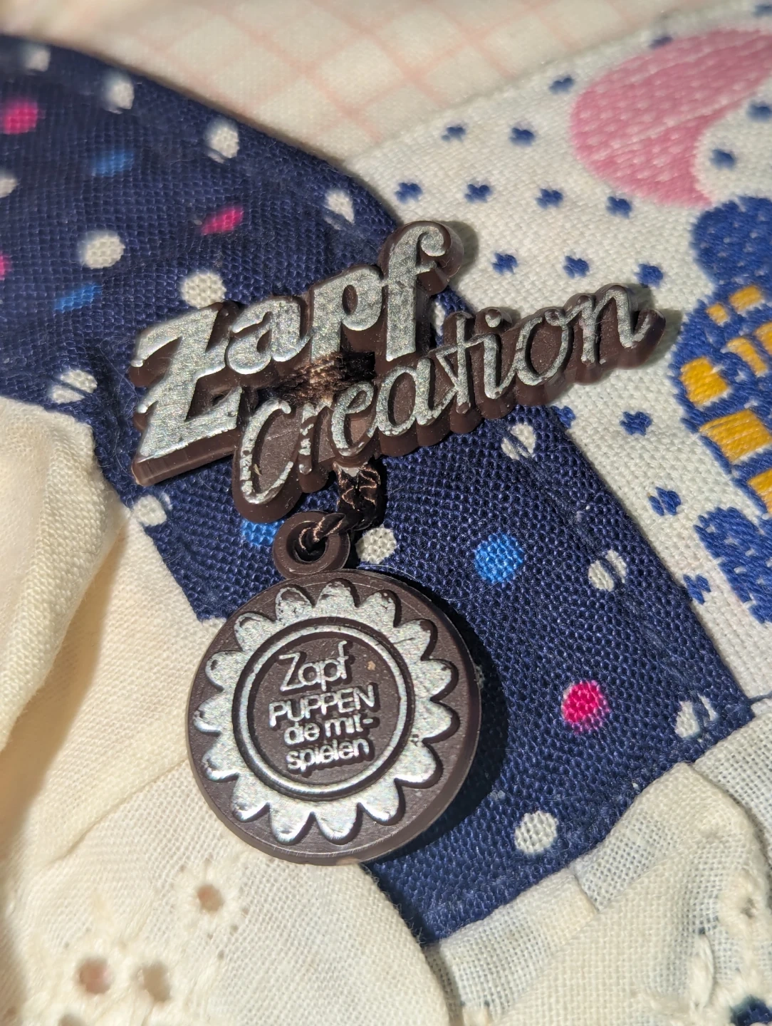 The doll with the blue dress has a ZAPF Creation tag on it.