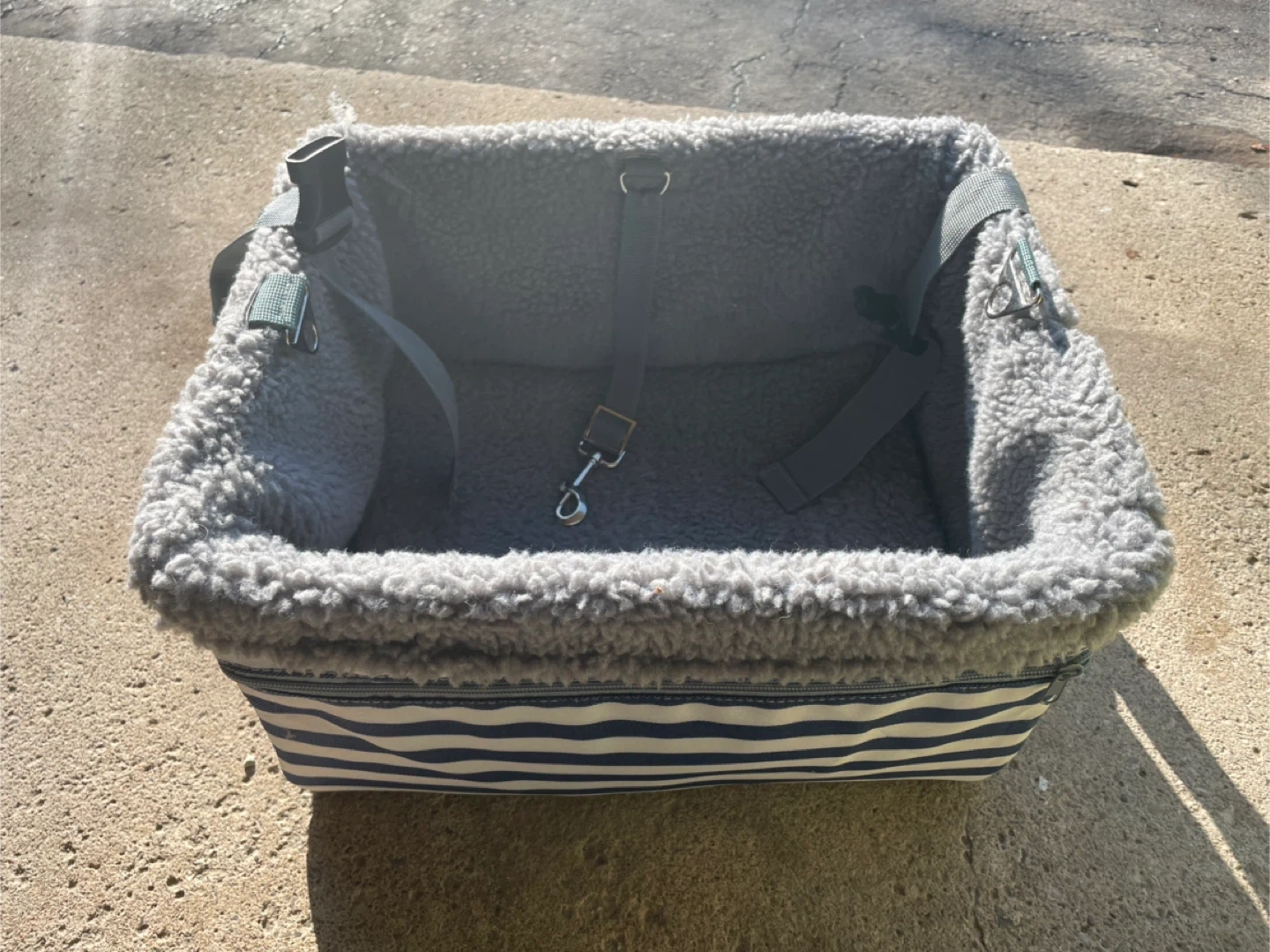 Keep your furry friend safe and comfy on car rides! This plush booster seat is lined with soft grey fleece and features a secure harness clip. The outer shell has a cute blue and white striped pattern.