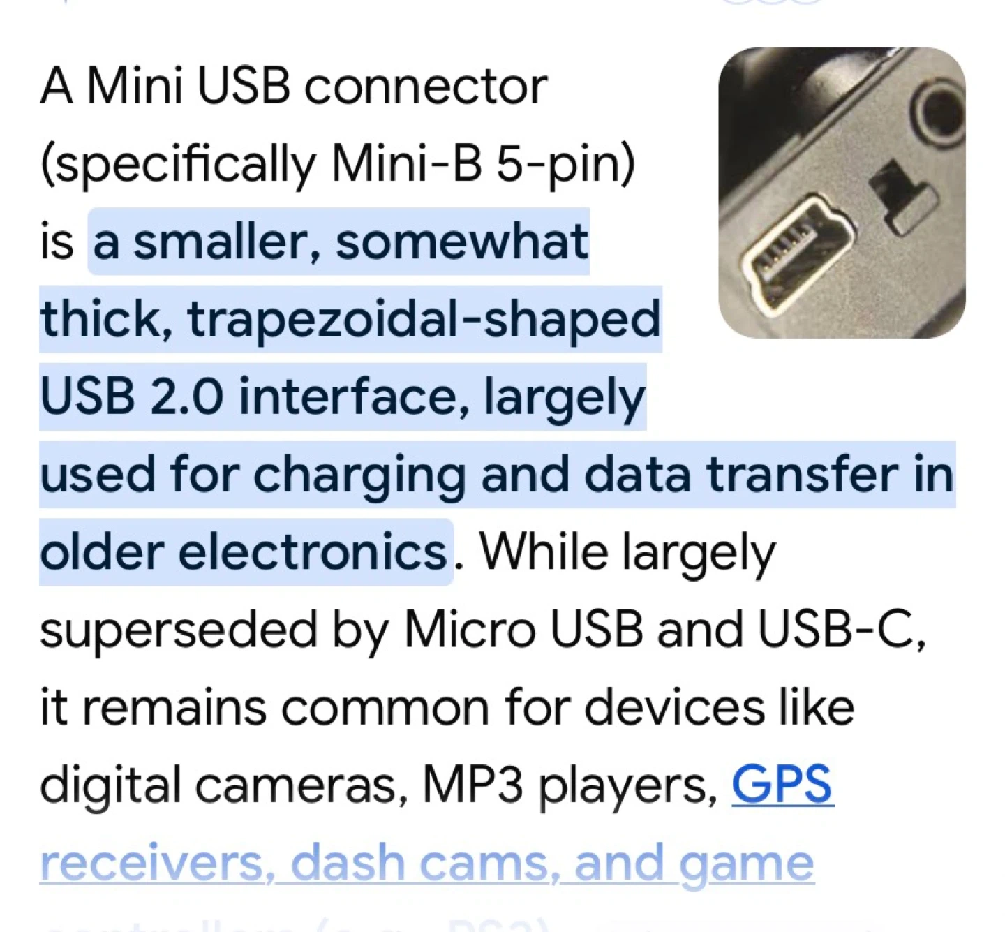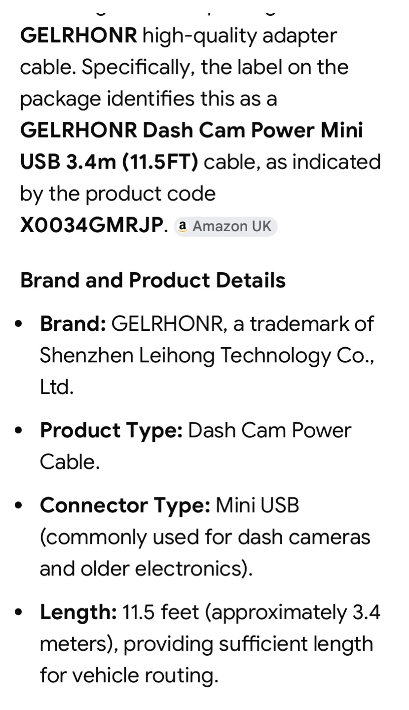 This is a GELRHONR high-quality adapter cable for dash cams. It features a Mini USB connector and is 11.5 feet long. The input is DC12-36V and the output is 5.0V/2.5A or 5.0V/3.1A. It's useful for powering dash cameras in vehicles. Also Compatible with older cameras, and Garmin Nuvi GPS. On and off button and one USB plug in.