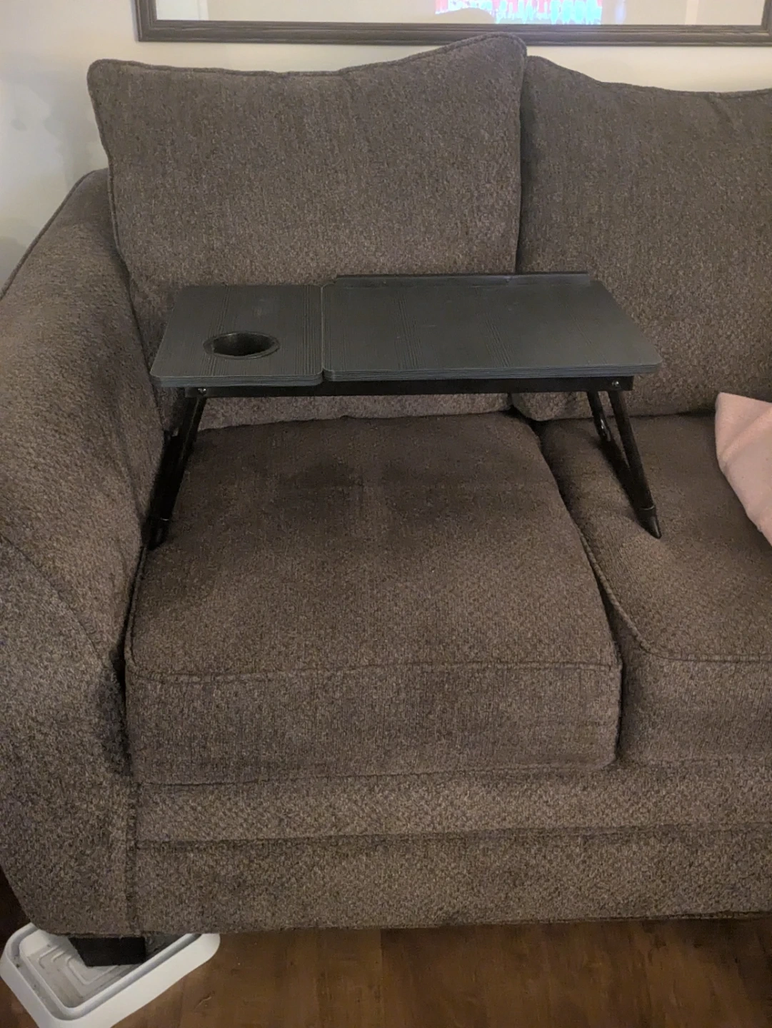 I'm selling a used lap desk, perfect for working or browsing on your laptop from the comfort of your couch or bed. It features a built-in cup holder. It's in good condition.