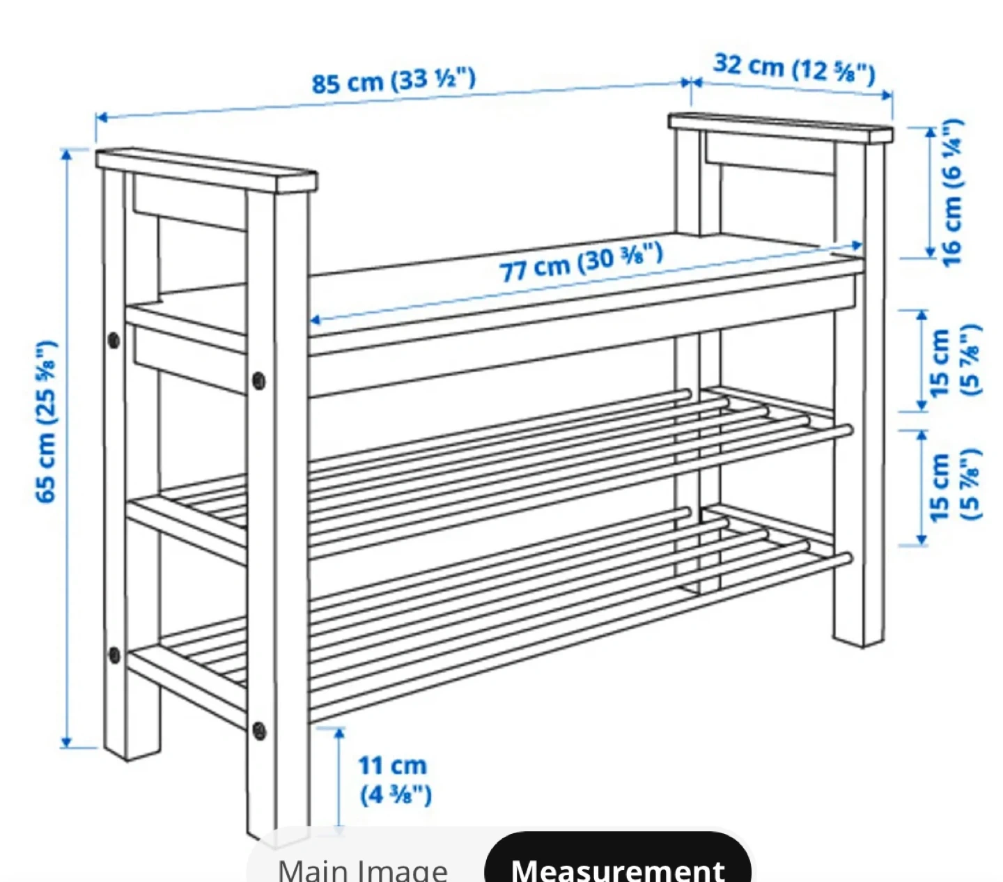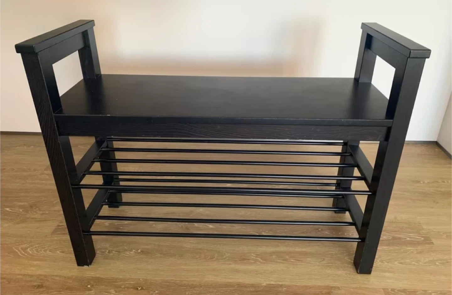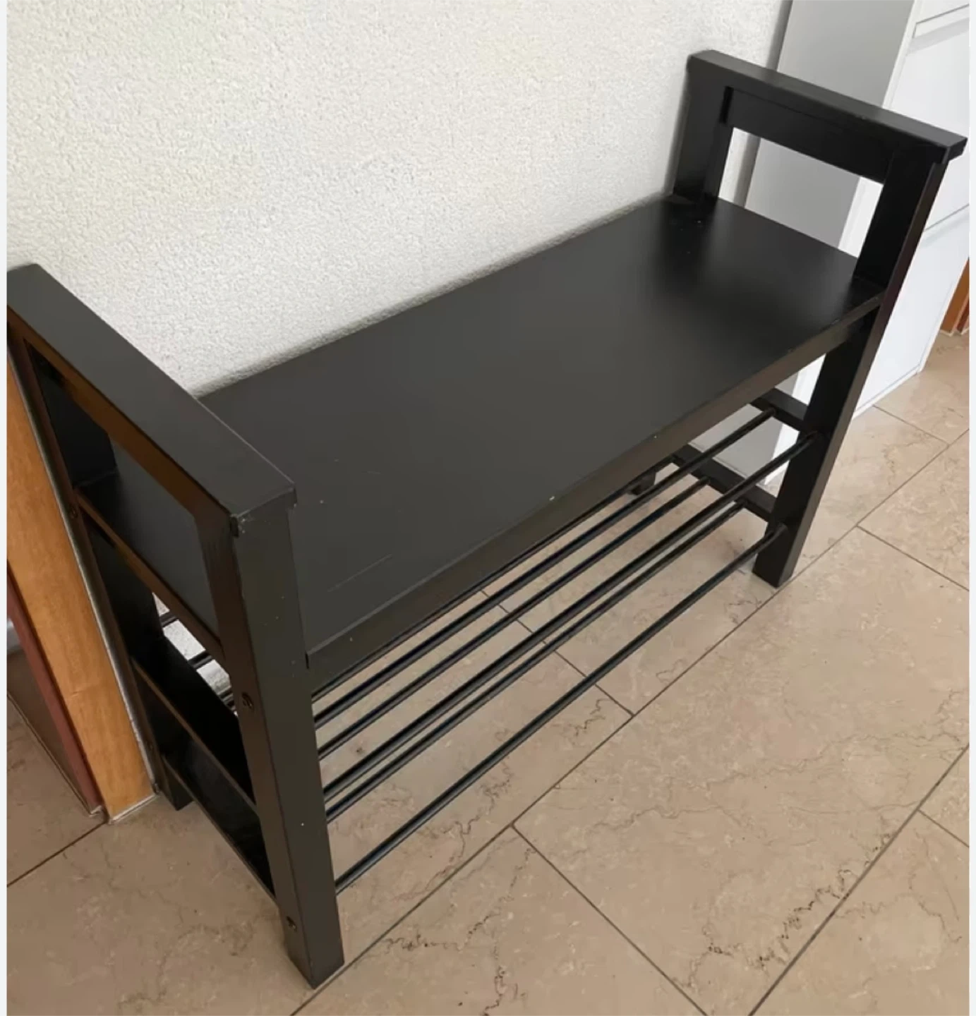 This brown wooden storage bench provides a place to sit and store shoes. It has a top surface and a lower shelf with multiple metal rods for shoe organization. Wood construction.