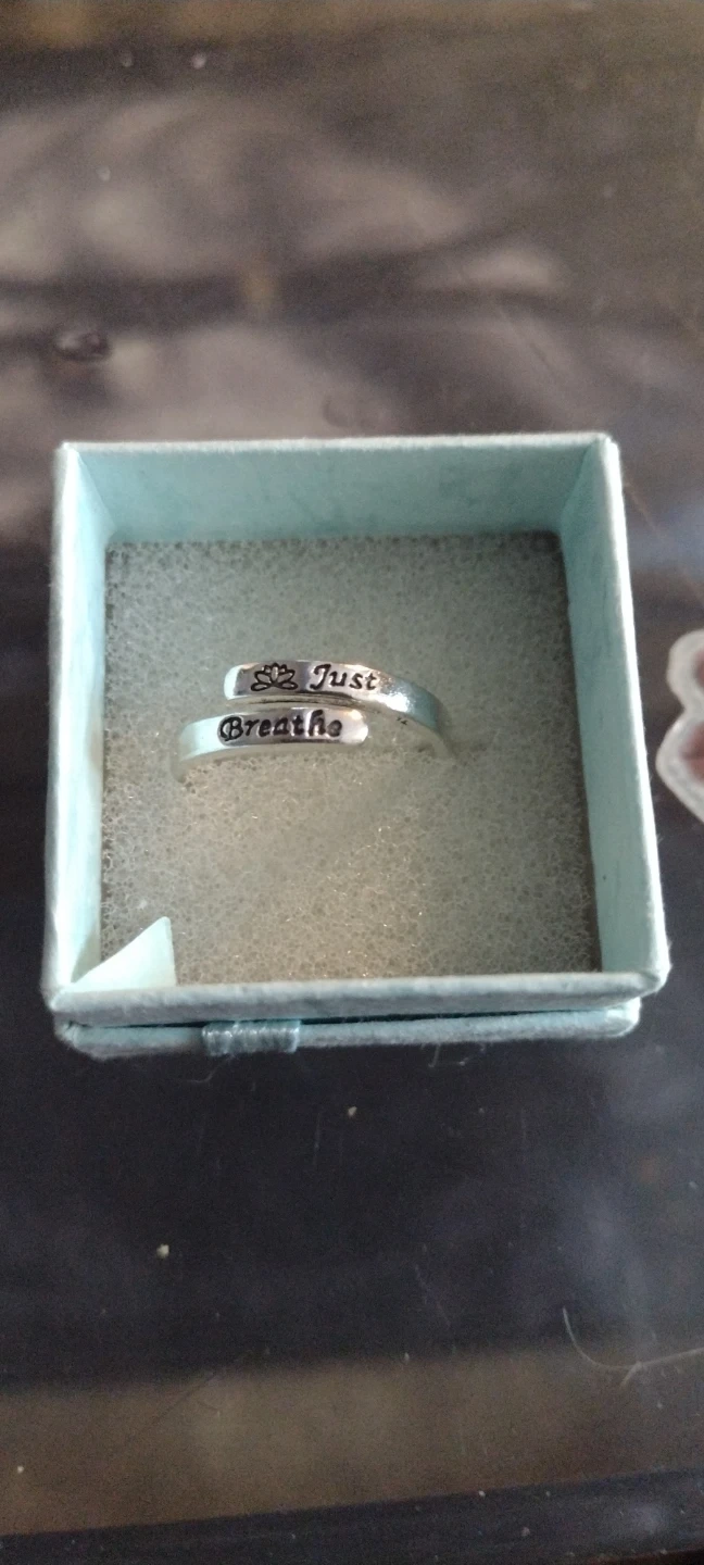 . Sterling Silver..Stamped.This adjustable ring features the engraved words "Just Breathe" along with a lotus flower design. It comes in a small light blue gift box, perfect for self-care or a thoughtful present.