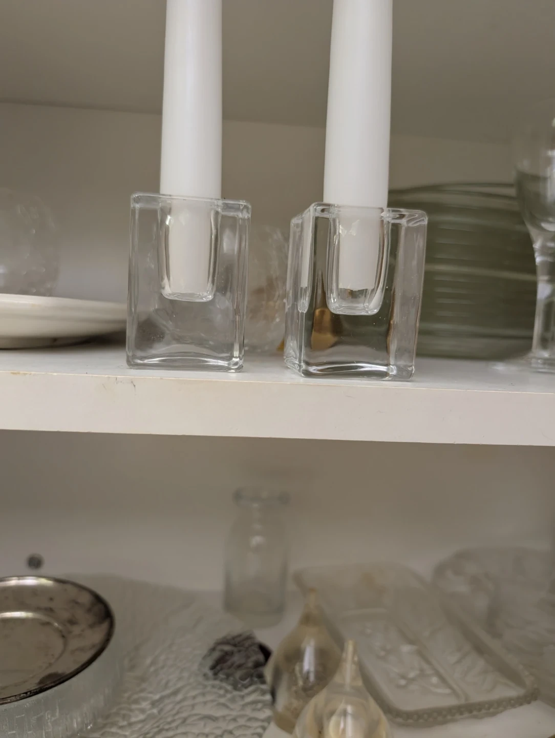 A set of two clear glass candlestick holders. Each holder has a cubic base with a tall, slender insert for a candle. These would be nice for adding a bit of ambiance to a dining table or shelf. They're made of sturdy glass.