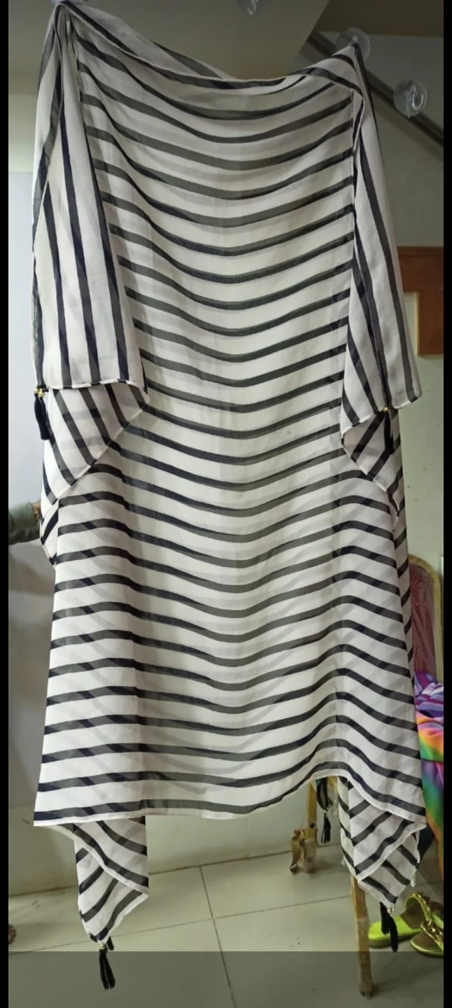 Lightweight white and black striped sheer coverup. Features a flowing silhouette with decorative tassels on the hem. This breezy top is perfect for layering or wearing on its own during warmer weather!