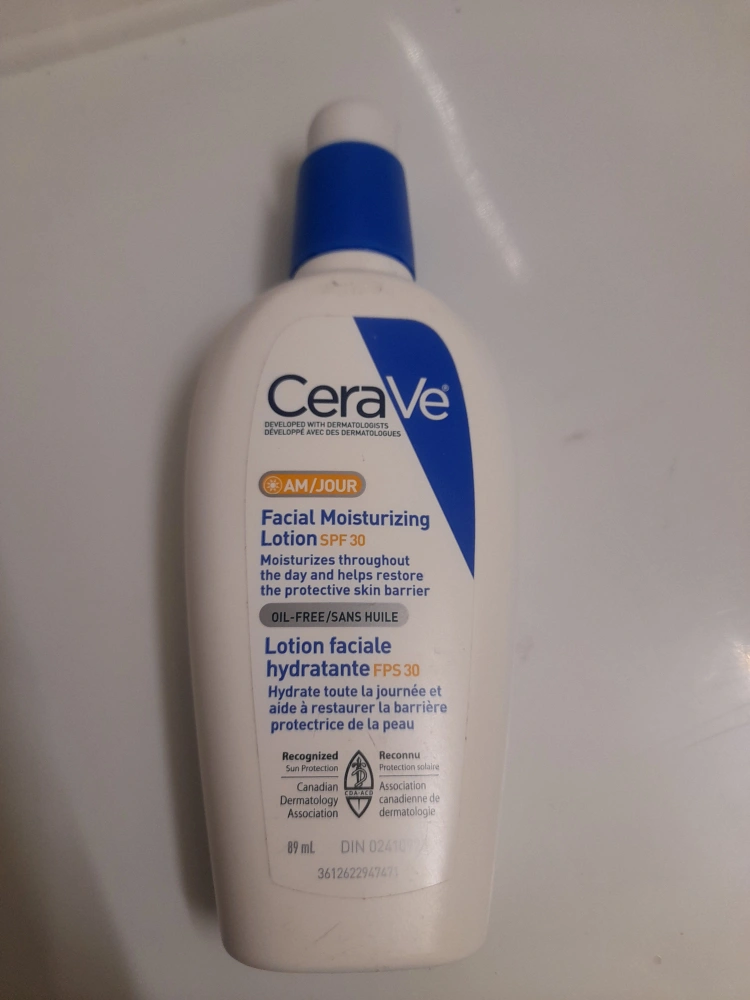 Cerave AM/Jour Facial Moisturizing Lotion with SPF 30. Moisturizes throughout the day and helps restore the protective skin barrier. Oil-free/sans huile. Expiry date 11/2026.