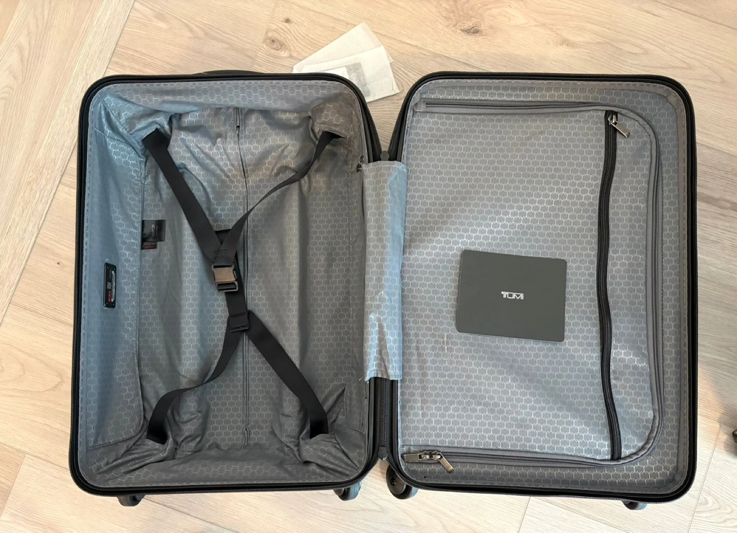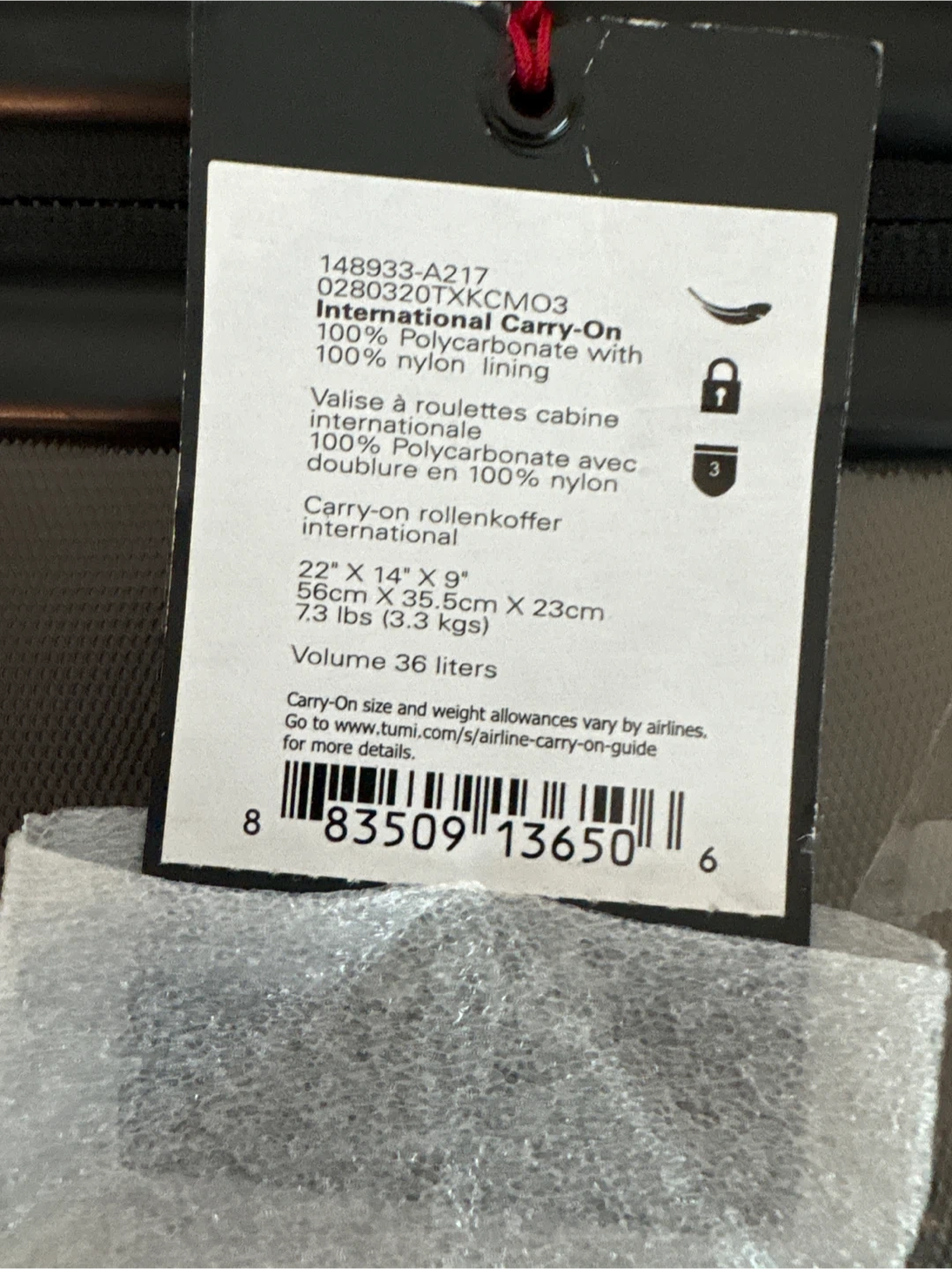 International carry-on luggage from Tumi. Made with 100% polycarbonate and a 100% nylon lining. It's 22" x 14" x 9" with a volume of 36 liters. This piece is great for travel!