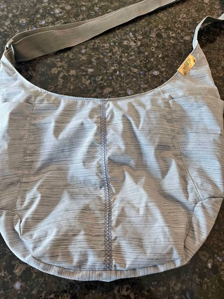 MEC crossbody bag in light grey. It has a zip closure, an inside zip pocket, and other pockets. There are also pockets on the sides. There are a few small stains on the inside, but they are barely noticeable and the bag has been recently washed. Located in Huntington Hills NW.
