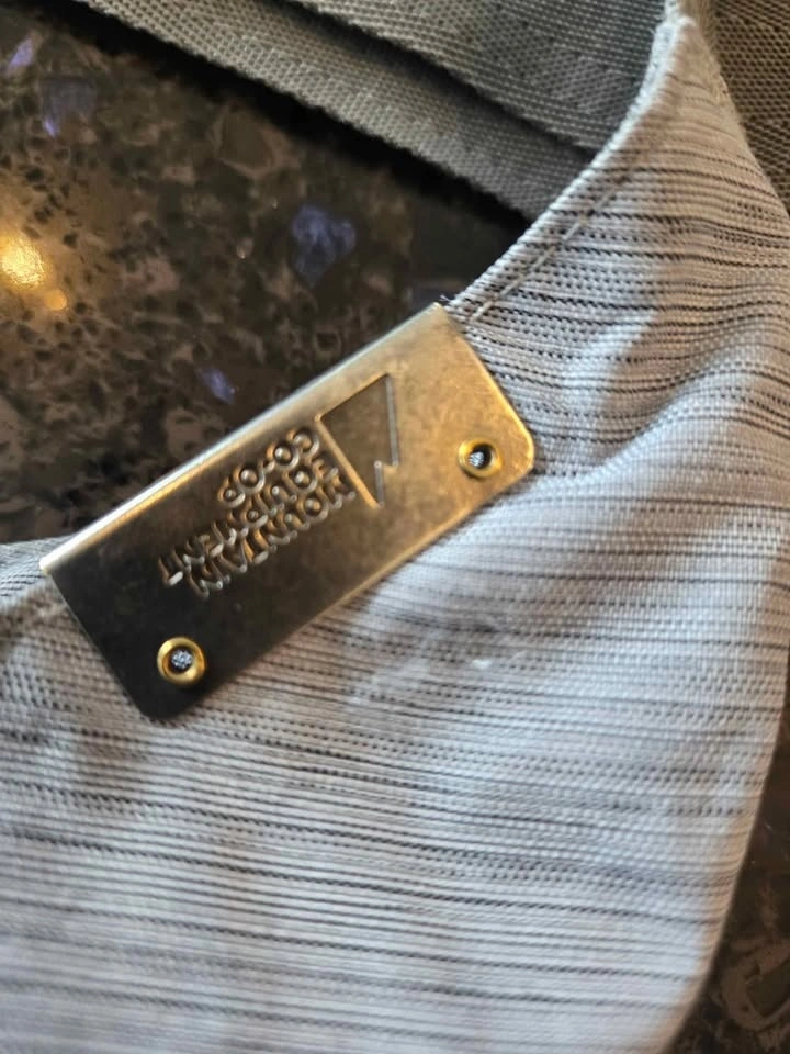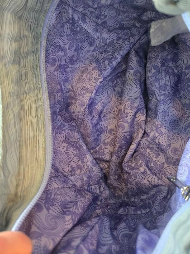 MEC crossbody bag in light grey. It has a zip closure, an inside zip pocket, and other pockets. There are also pockets on the sides. There are a few small stains on the inside, but they are barely noticeable and the bag has been recently washed. Located in Huntington Hills NW.