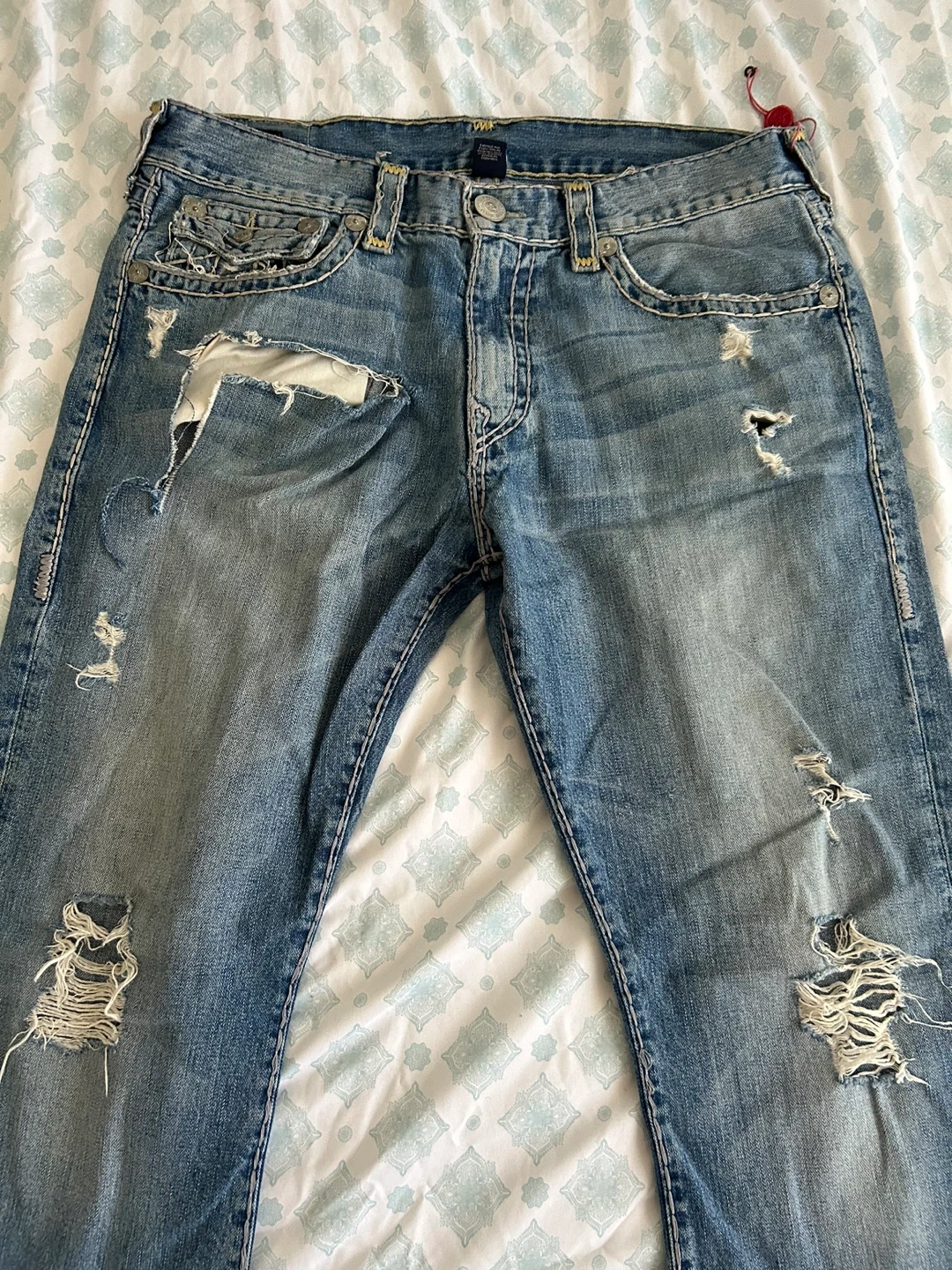 These are distressed blue denim jeans from True Religion. They're a classic straight-leg fit with detailed stitching. Made of 100% cotton.