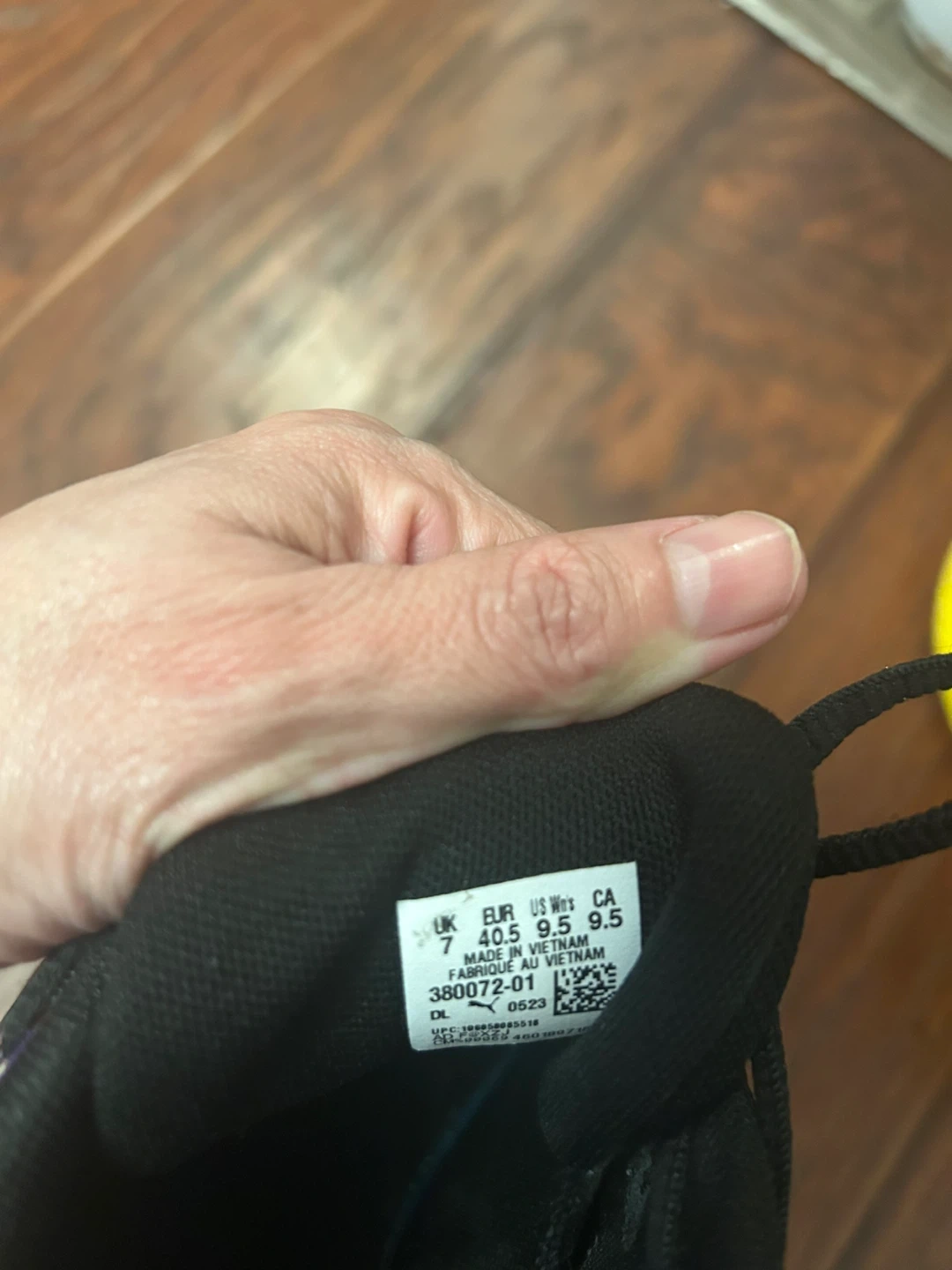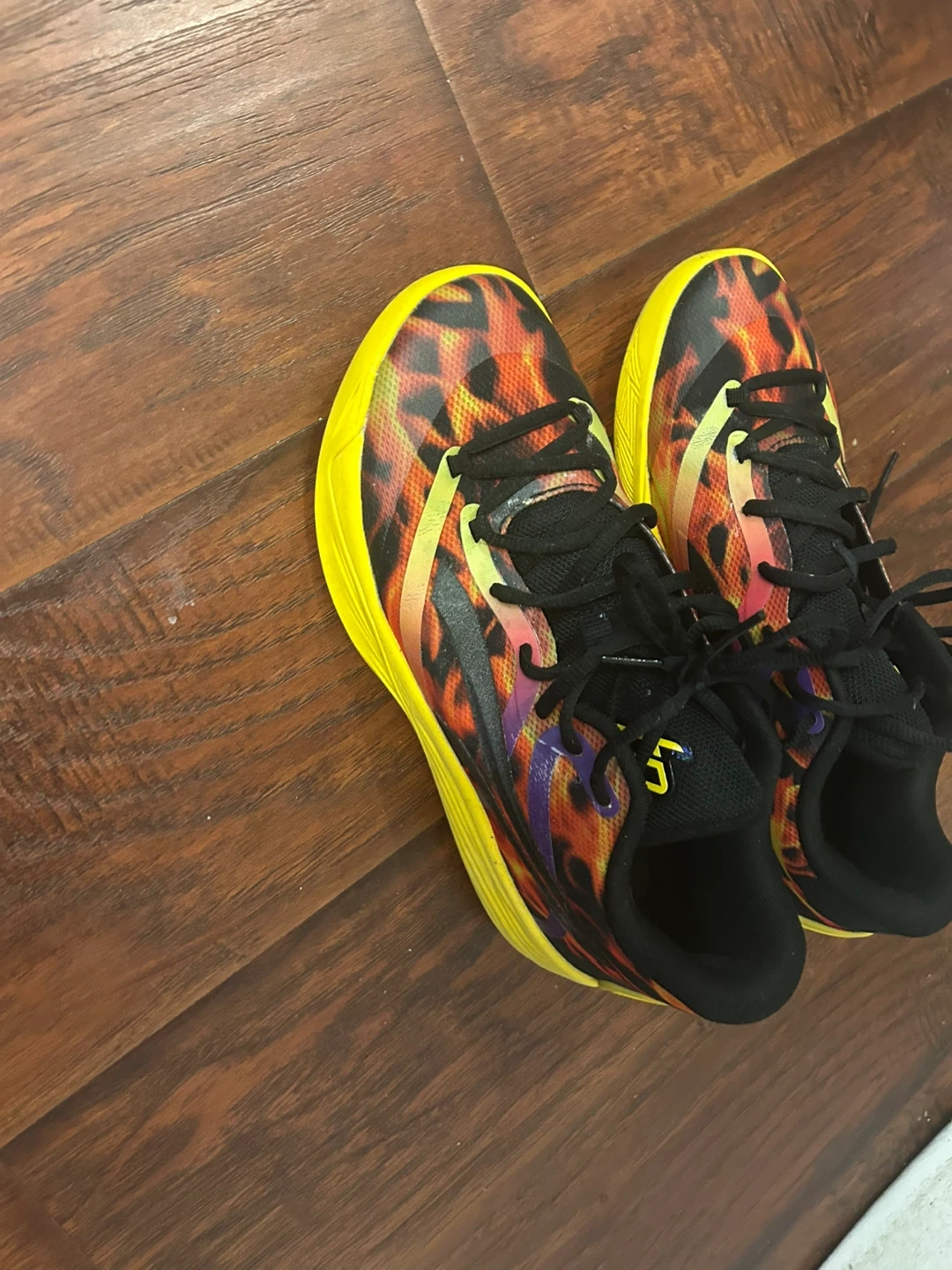 Puma basketball shoes with a flame graphic design and yellow soles. These are size 7 UK, 40.5 EUR, 9.5 US Men's, and 9.5 US Women's. Made in Vietnam.