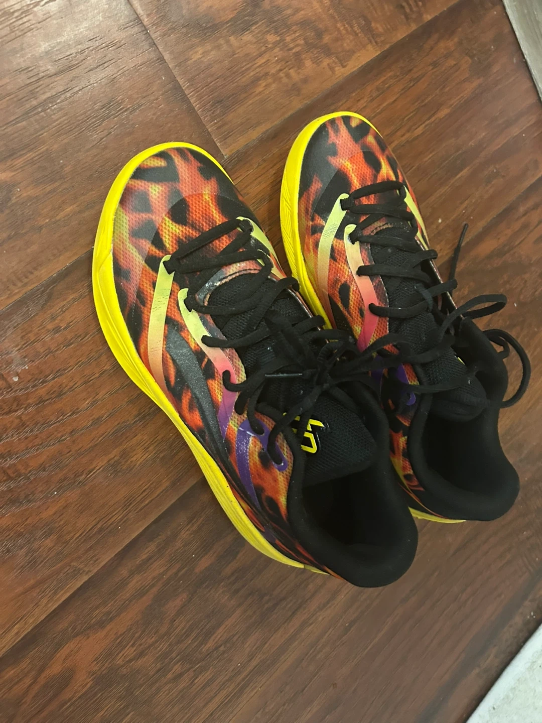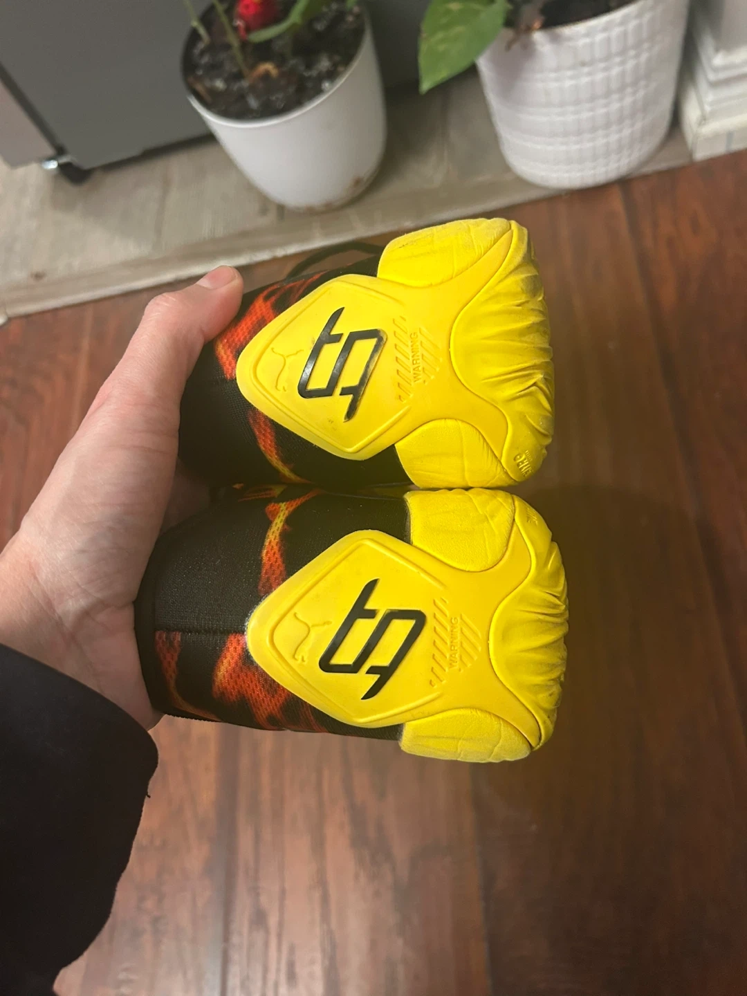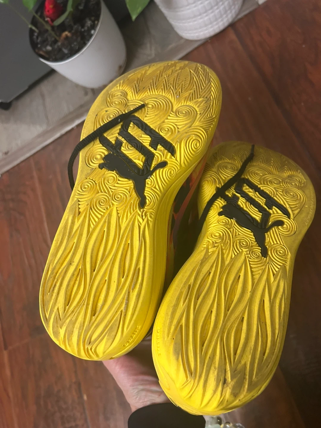 Puma basketball shoes with a flame graphic design and yellow soles. These are size 7 UK, 40.5 EUR, 9.5 US Men's, and 9.5 US Women's. Made in Vietnam.