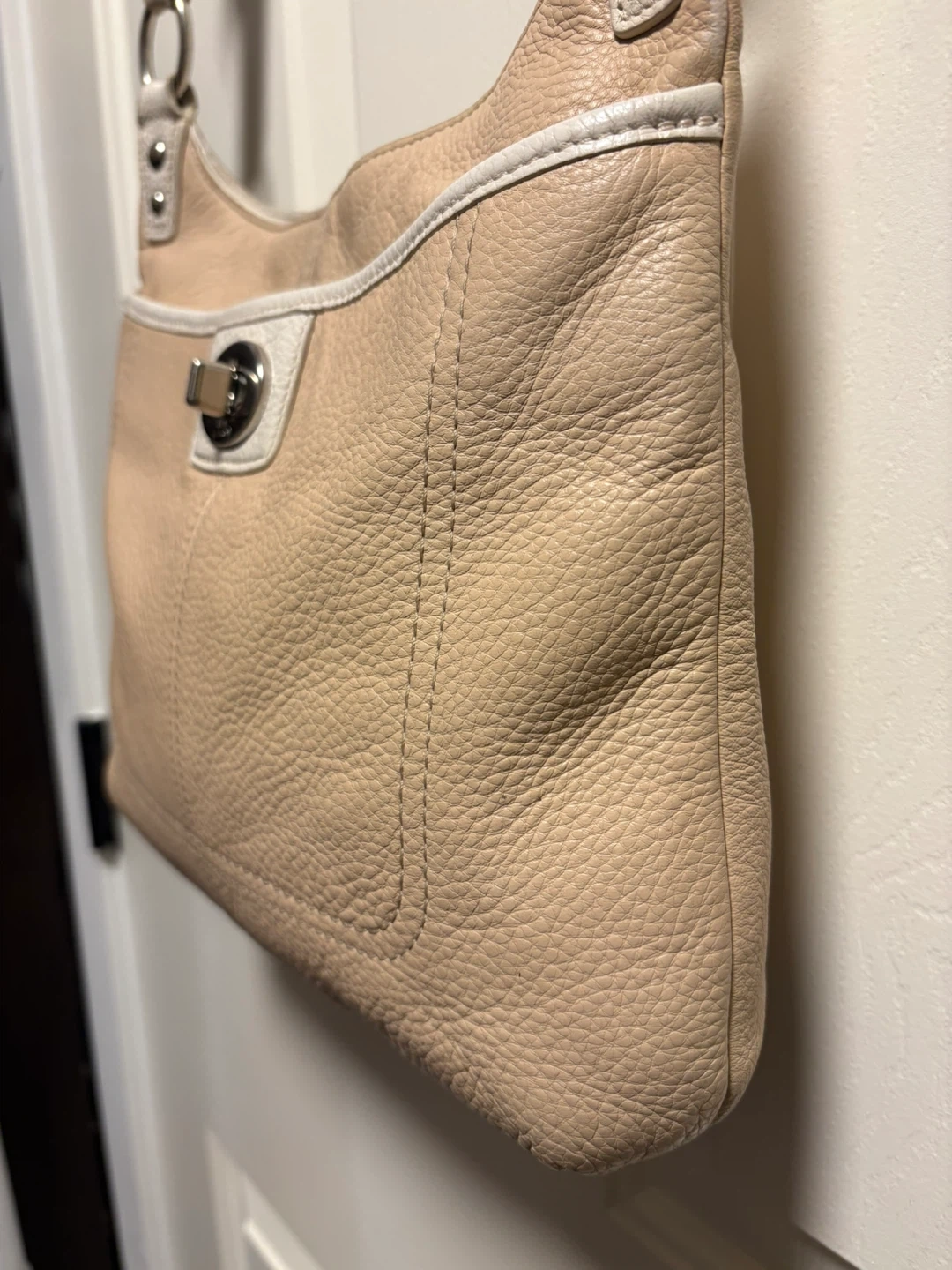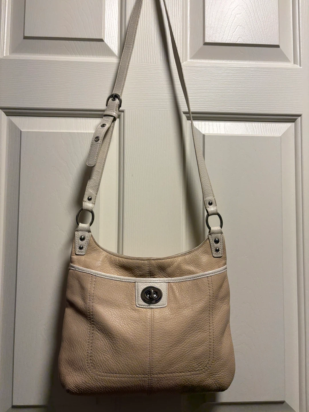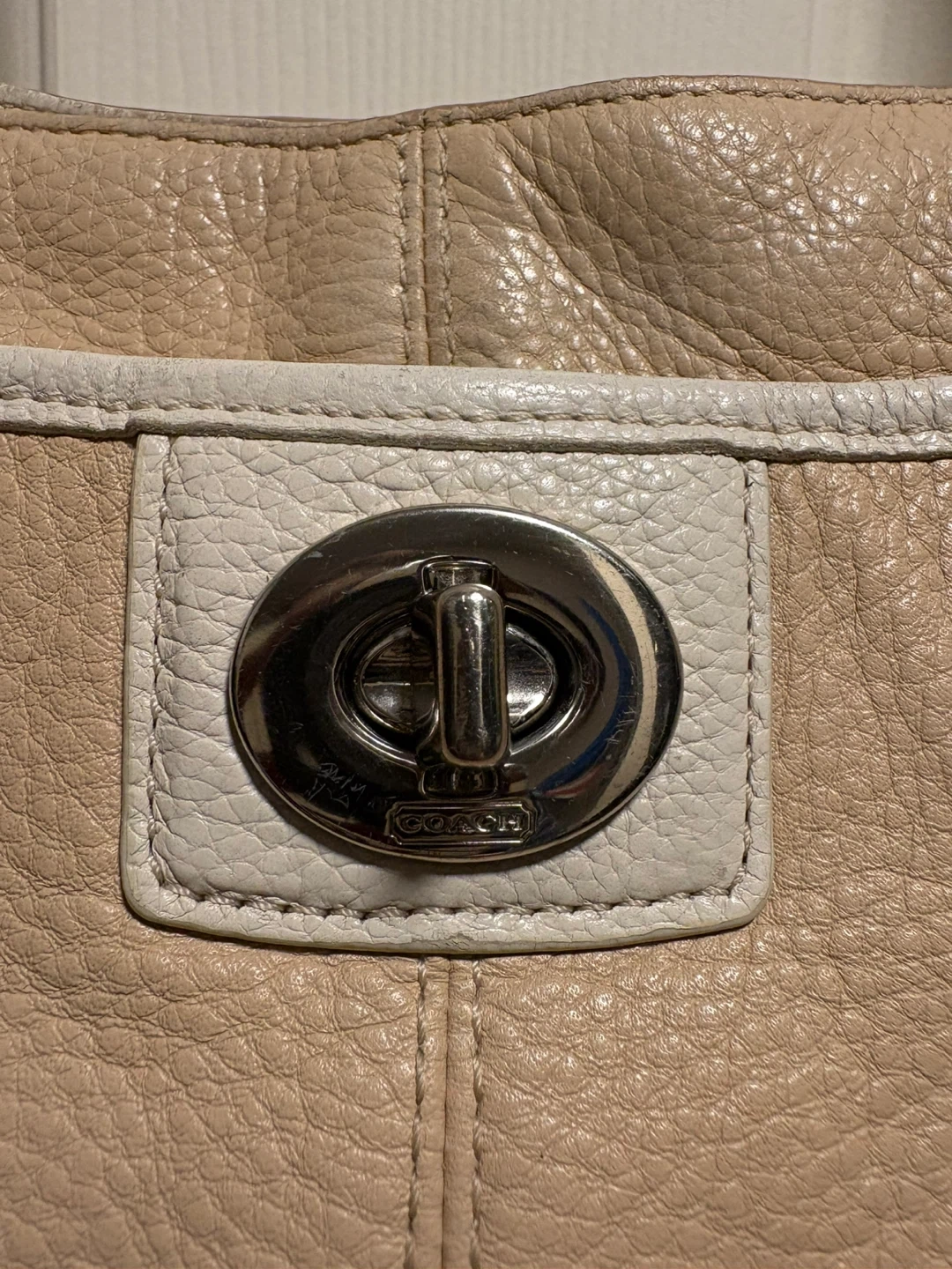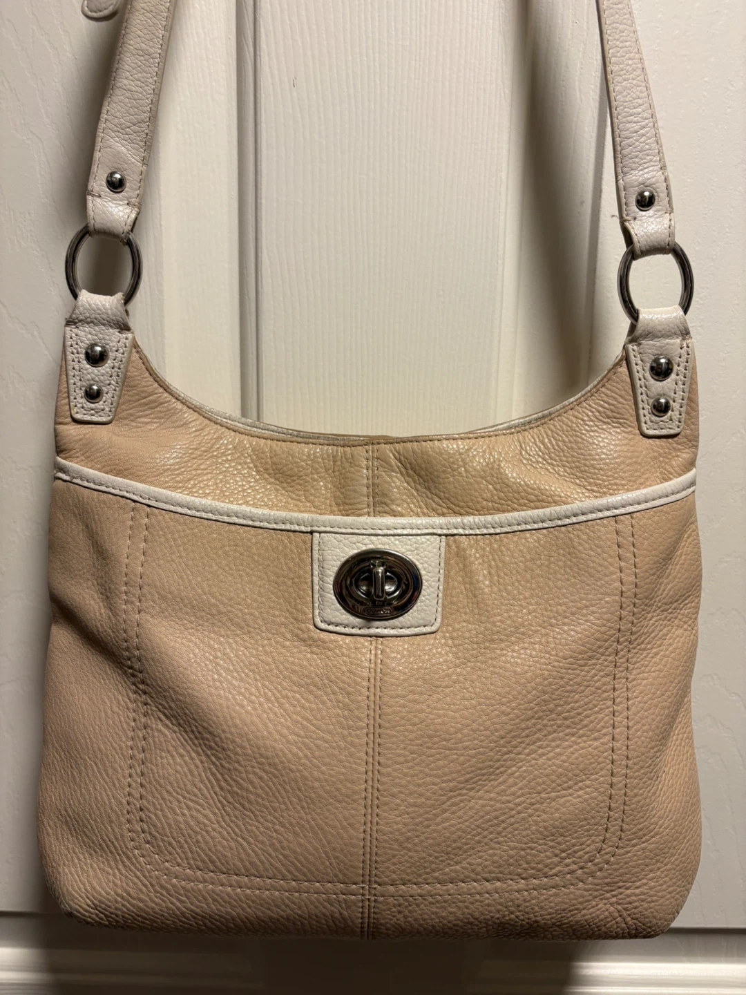 Coach shoulder bag in a soft beige pebbled leather. It has a turn-lock closure and white trim detail. This stylish bag is made of genuine leather. The bag is in pretty good condition, just a bit of discolouration on the front left corner, and on the leather trim inside the bag, please see pictures, it’s almost unnoticeable. Pick up in Chestermere.