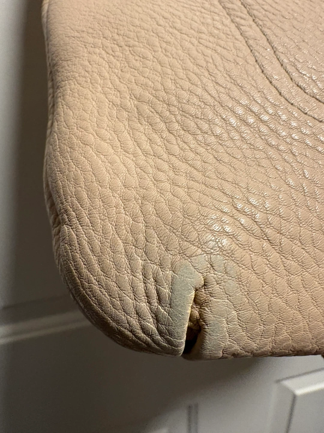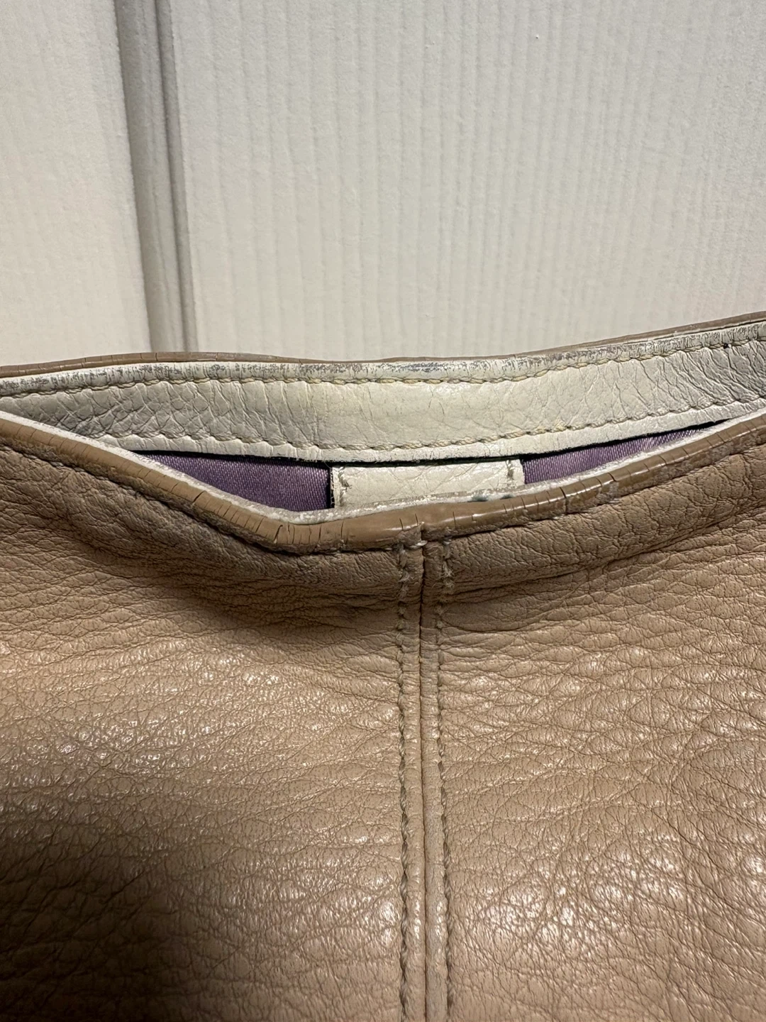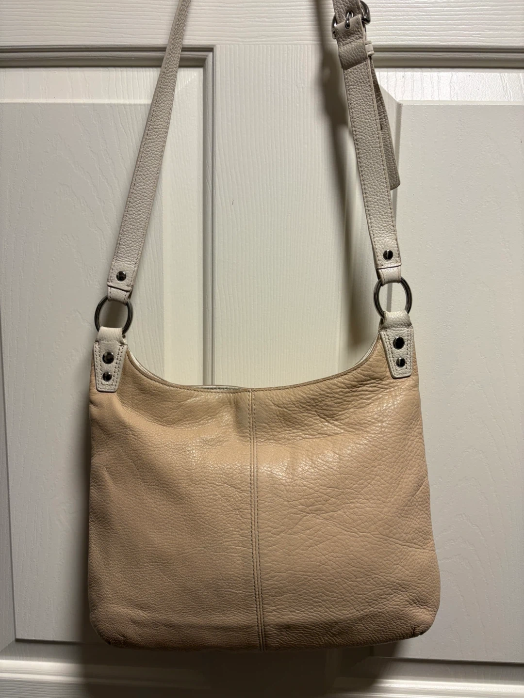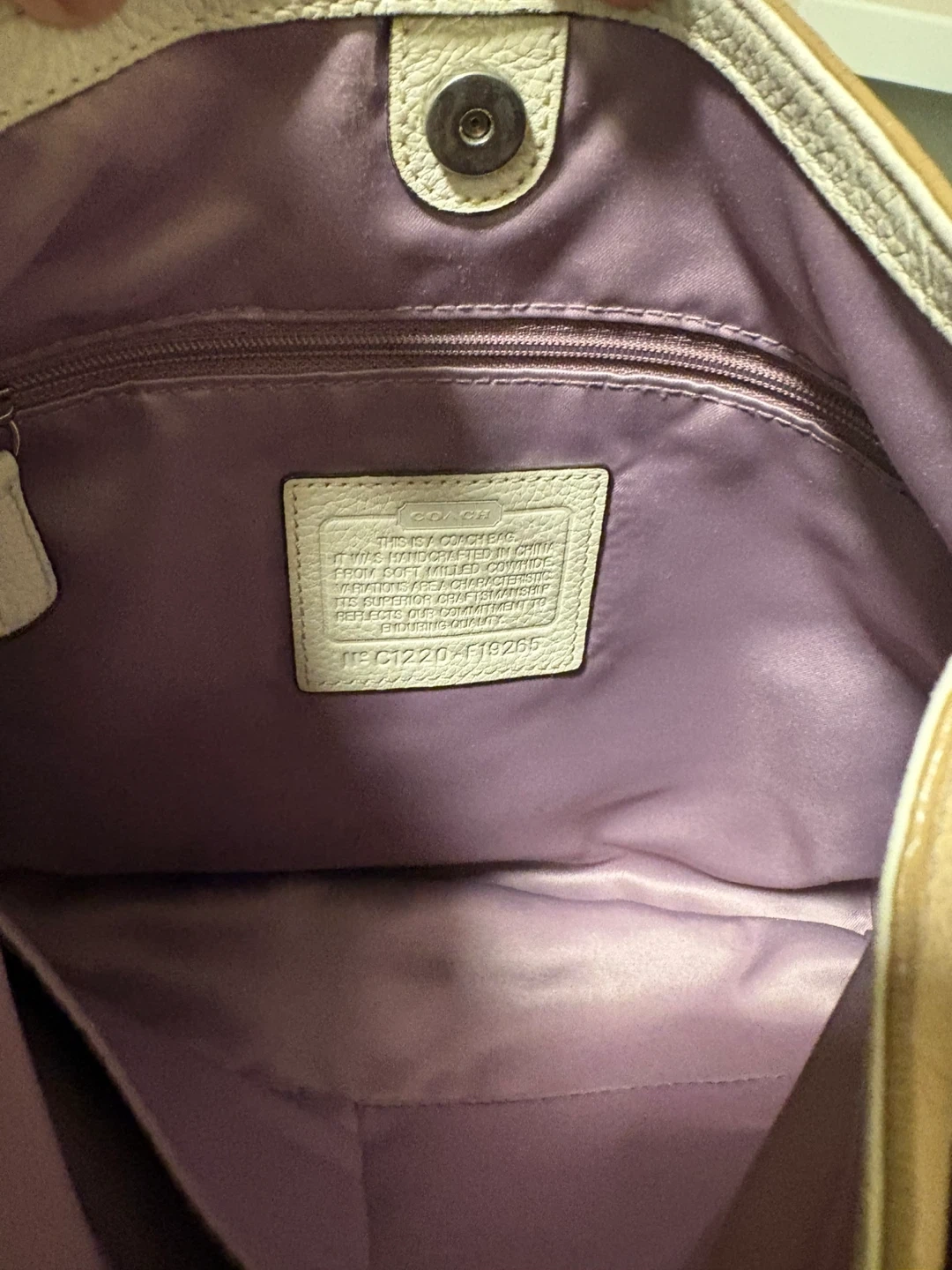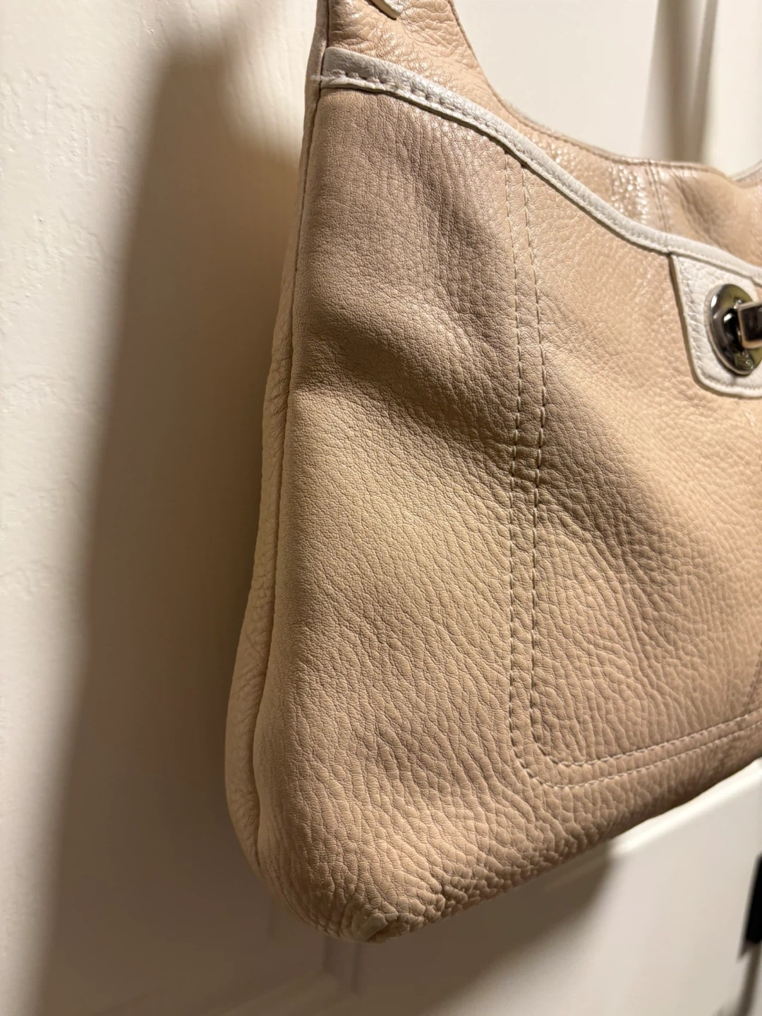 Coach shoulder bag in a soft beige pebbled leather. It has a turn-lock closure and white trim detail. This stylish bag is made of genuine leather. The bag is in pretty good condition, just a bit of discolouration on the front left corner, and on the leather trim inside the bag, please see pictures, it’s almost unnoticeable. Pick up in Chestermere.