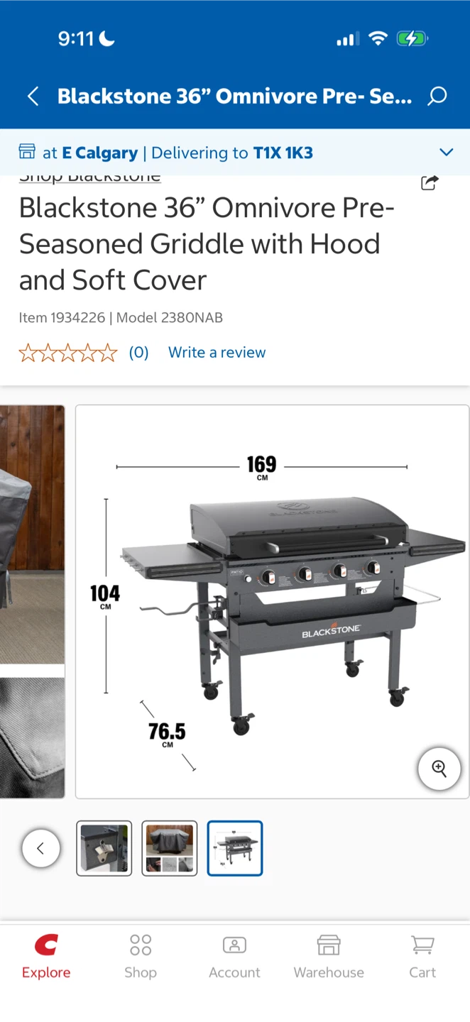This is a Blackstone 36 inch Omnivore griddle. It includes a hood and a soft cover. Dimensions are 169 cm wide by 104 cm high and 76.5 cm deep. Comes with accessories.