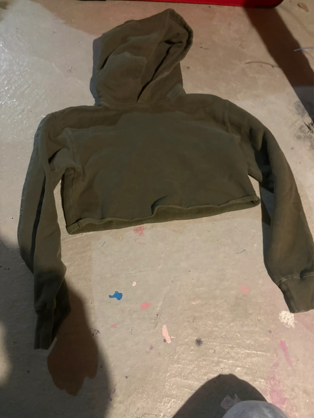 TNA cropped hoodie in olive green. Size XS. This hoodie is made with a soft fleece material, perfect for casual wear.