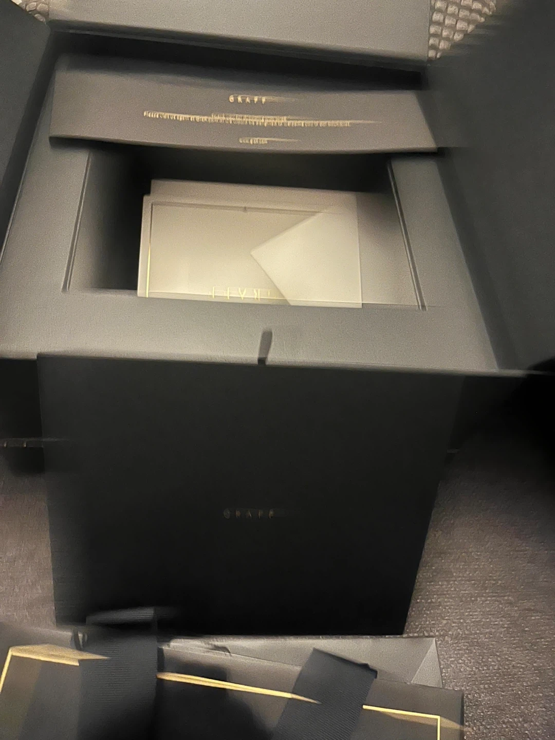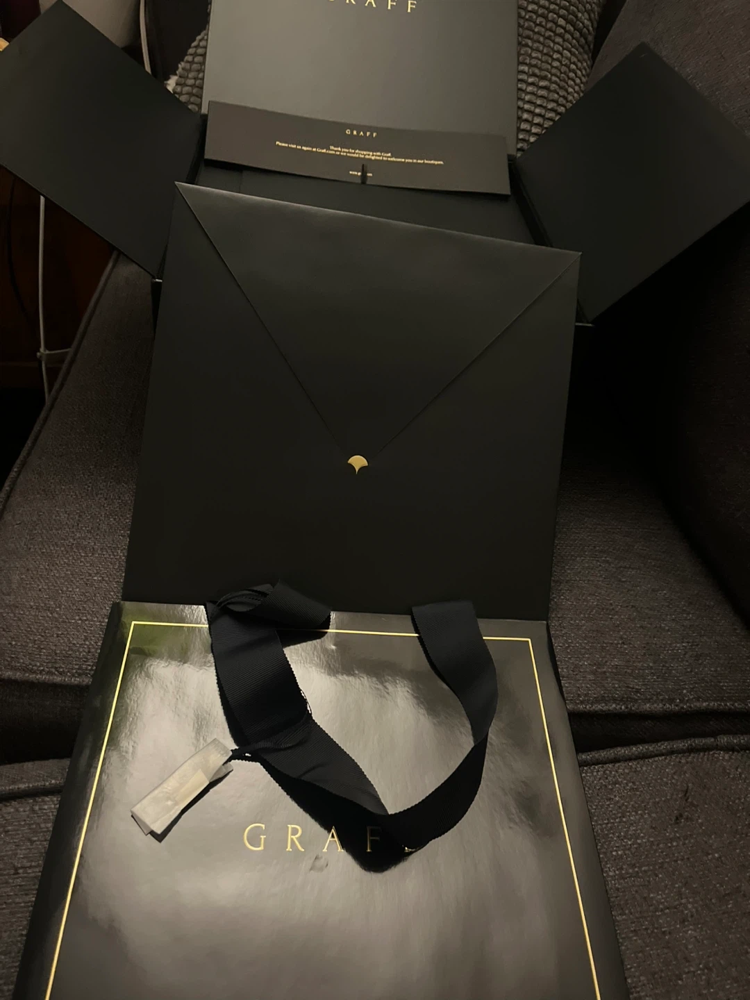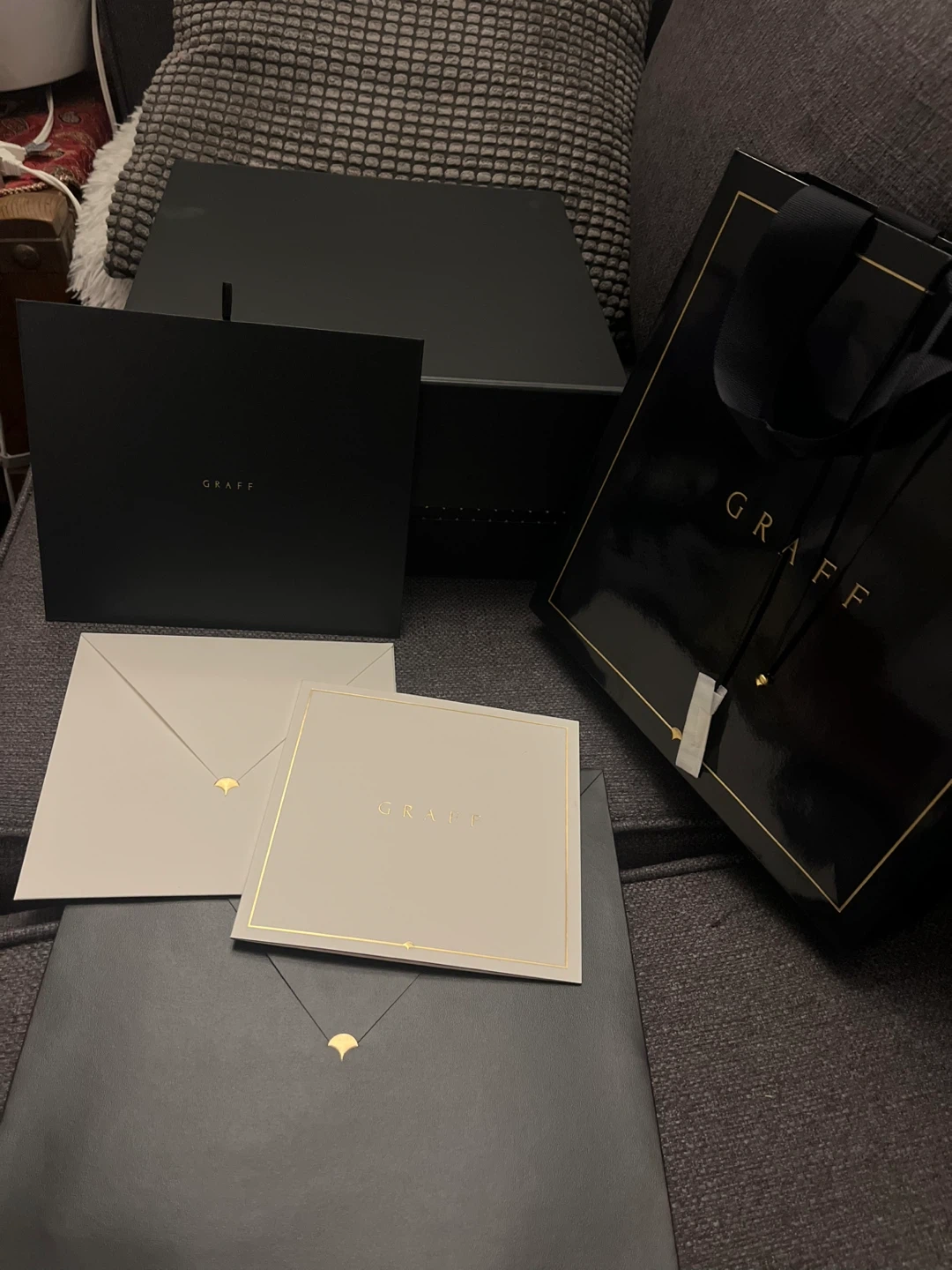 This is a Graff packaging set. It includes the branded shopping bag, boxes, and envelopes. All items are in excellent condition.