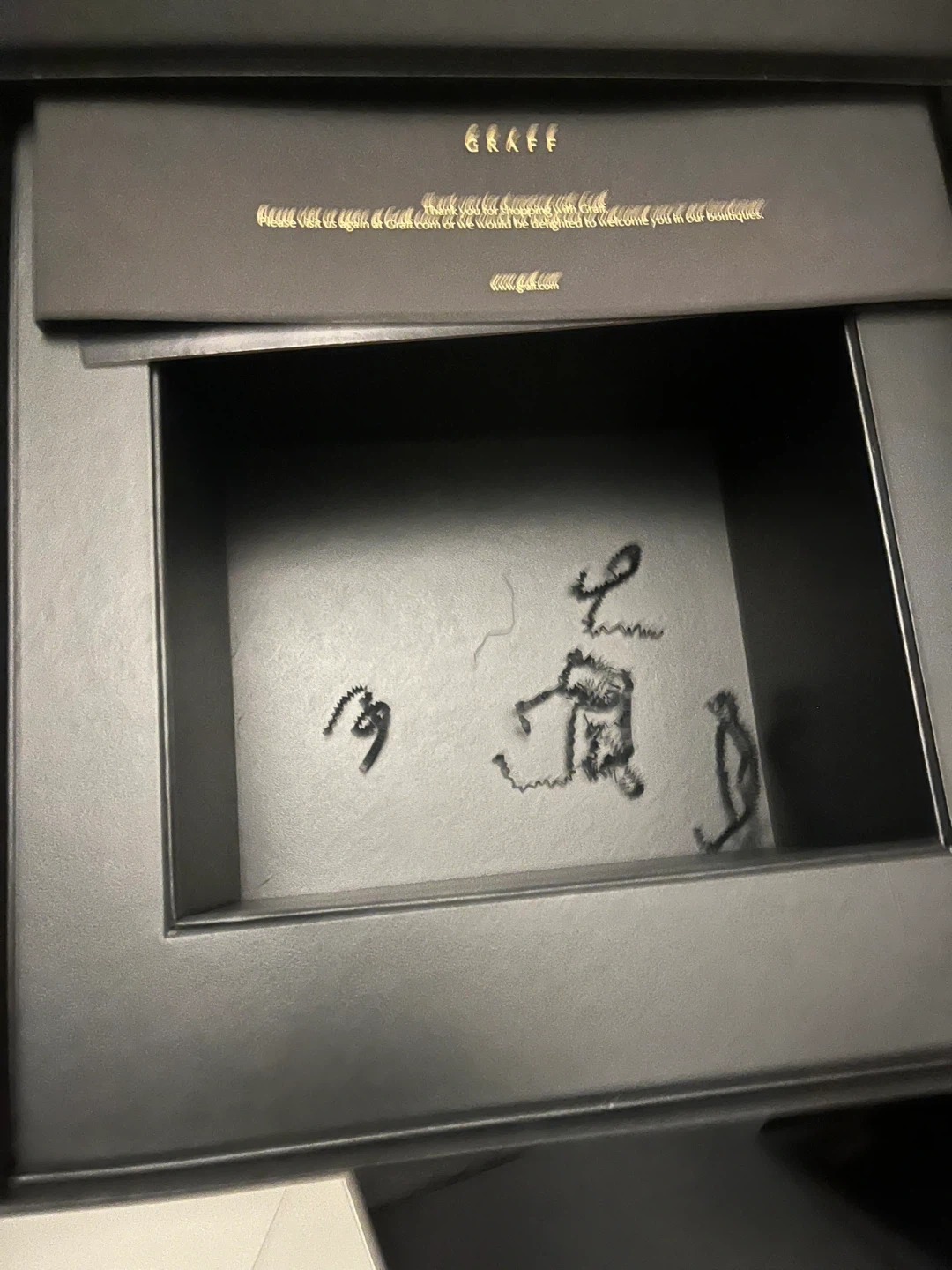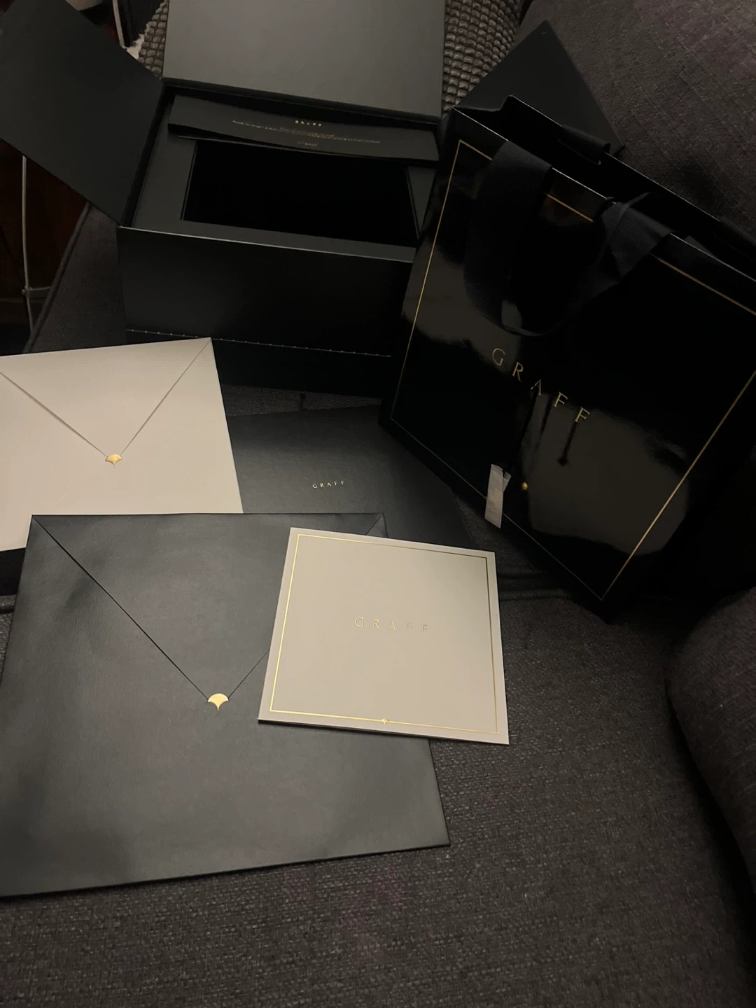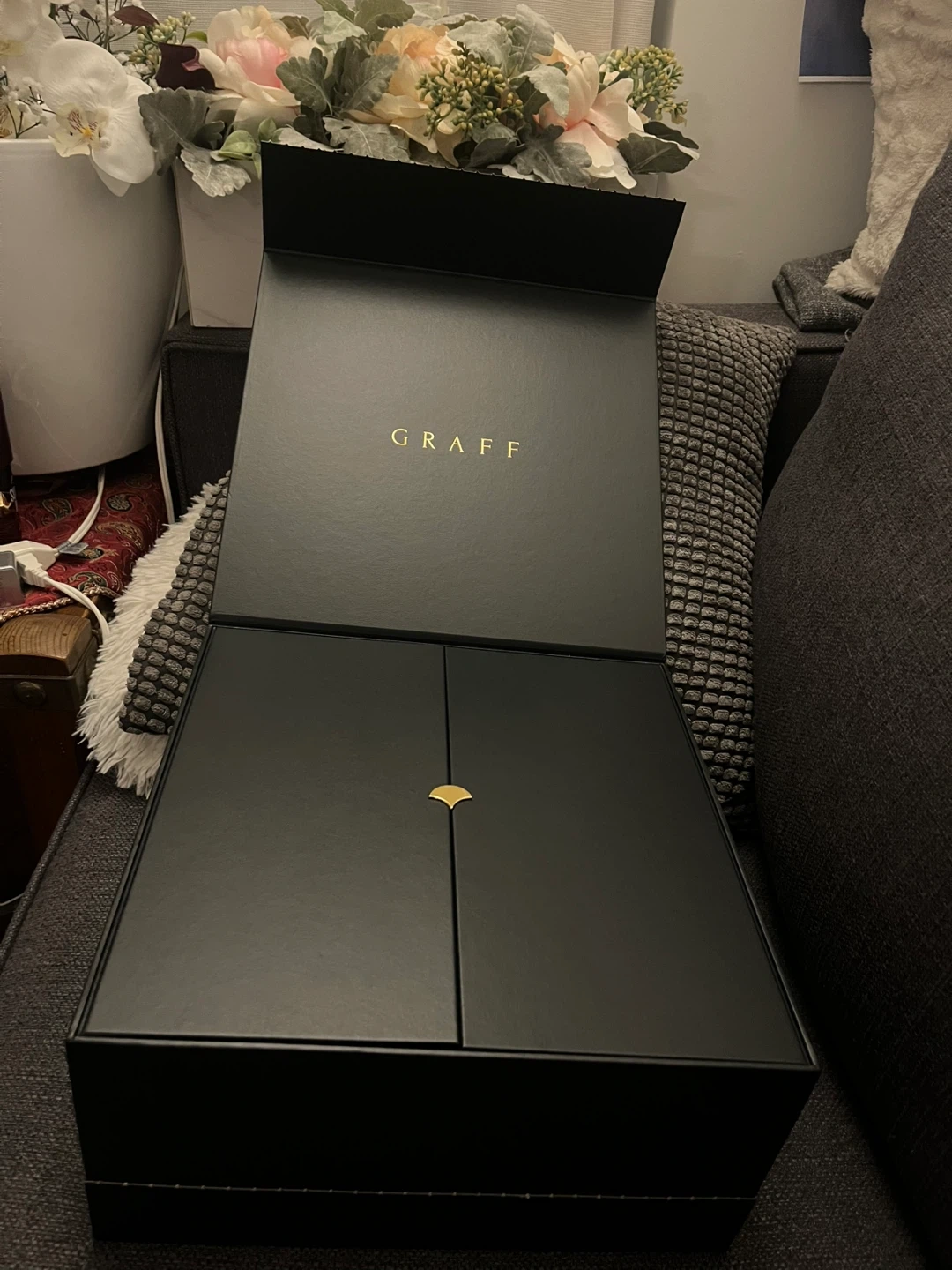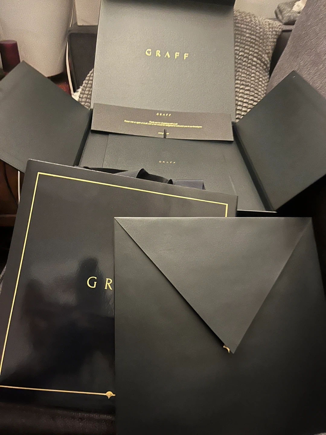 This is a Graff packaging set. It includes the branded shopping bag, boxes, and envelopes. All items are in excellent condition.