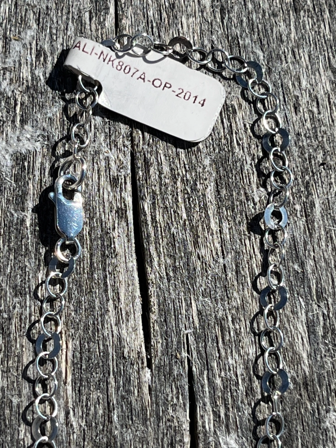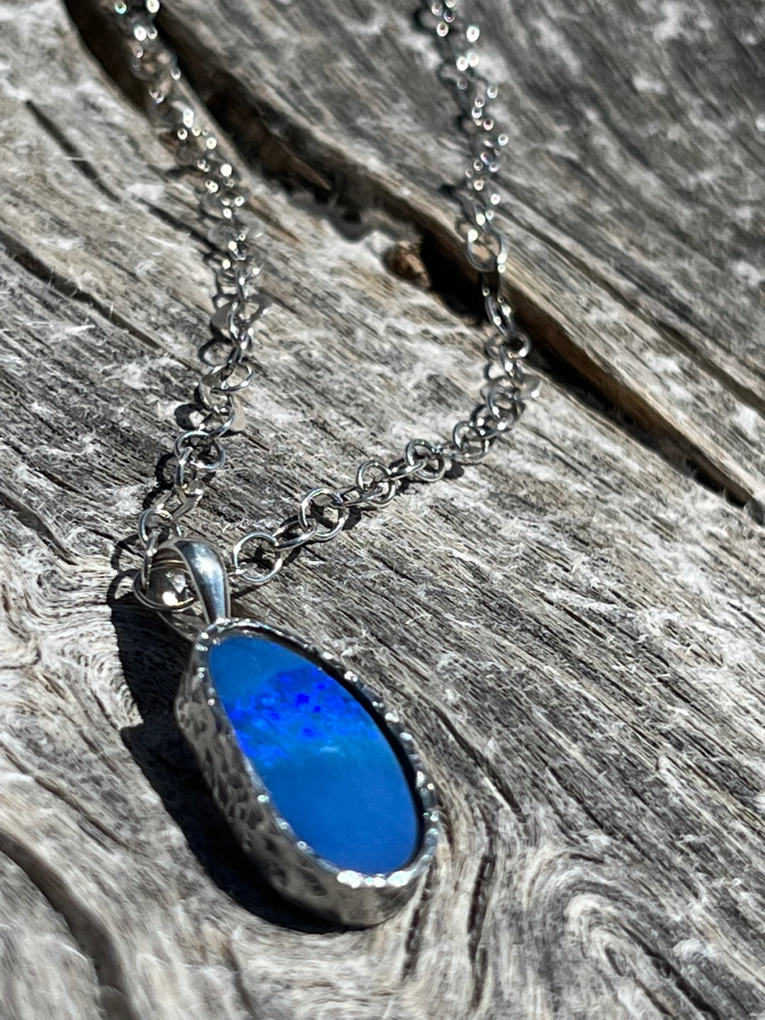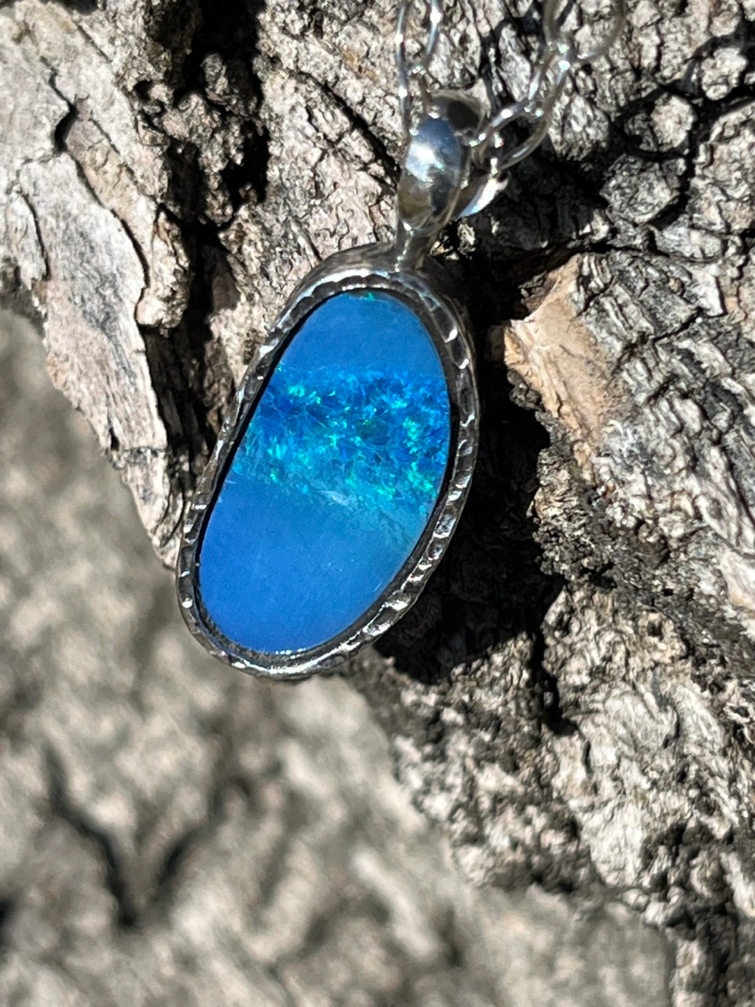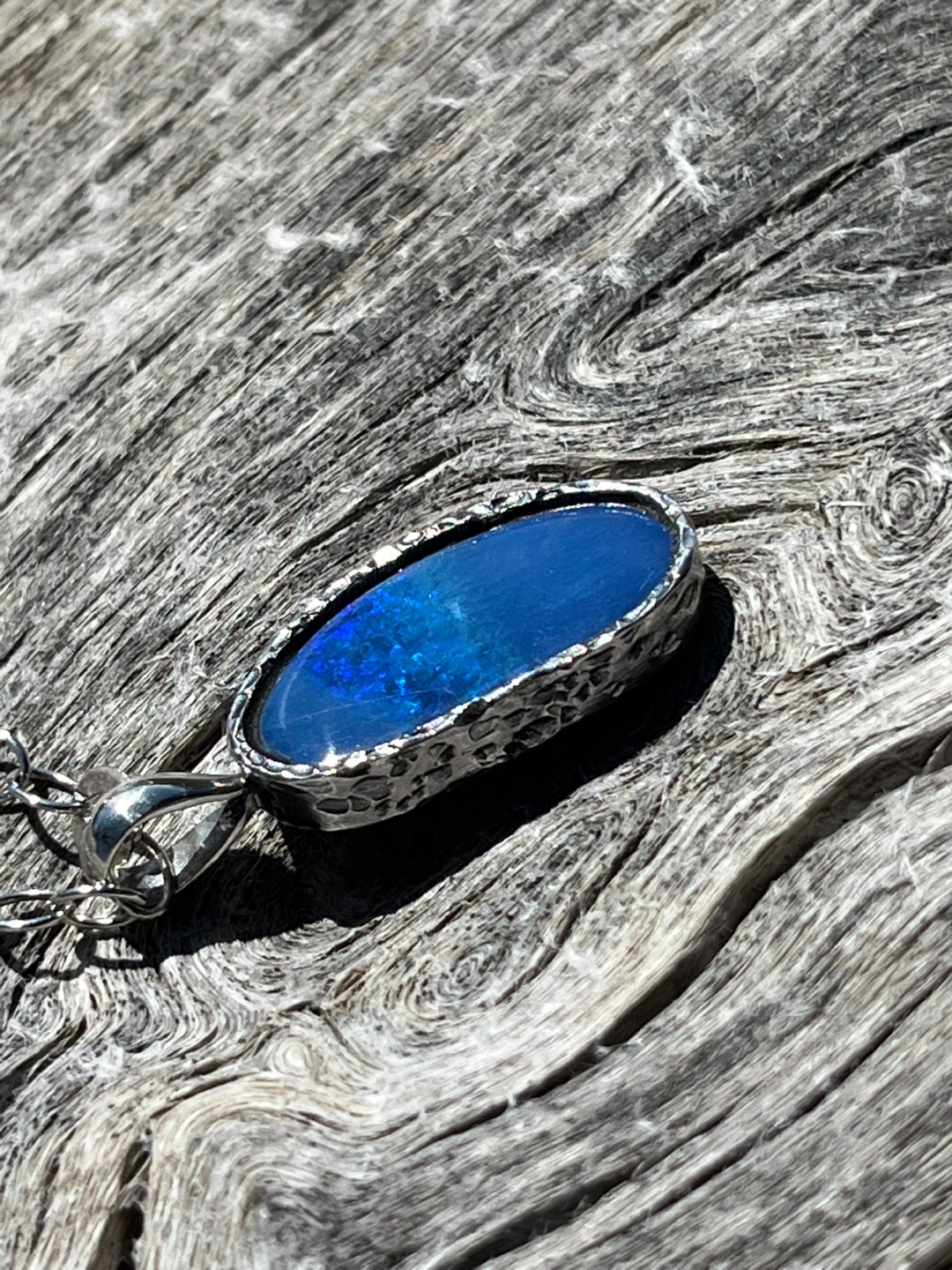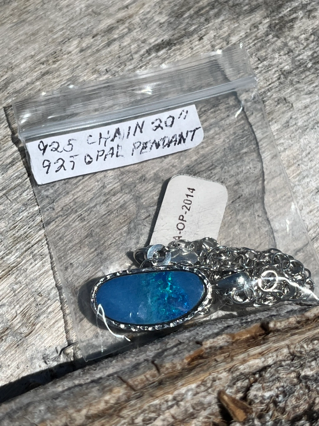 Beautiful blue opal pendant necklace. Features a 925 sterling silver chain and setting. Oval-shaped opal stamped 925 signed Didae Lobster clasp closure. Pendant measures approximately 20mm in length. Can meet in various local public areas and deliver.