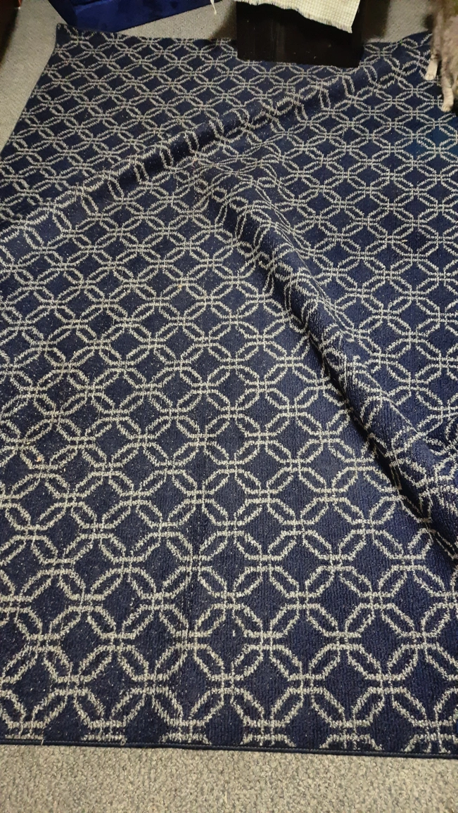 Blue and grey area rug with geometric pattern. Has a non-slip backing.