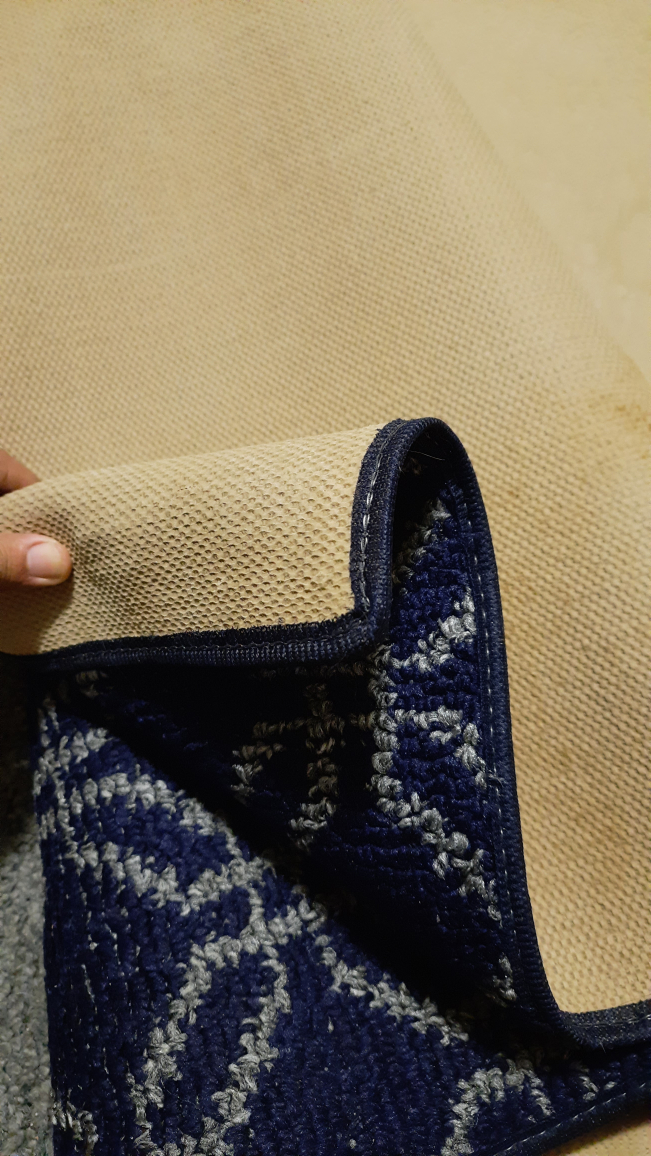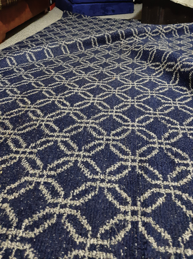 Blue and grey area rug with geometric pattern. Has a non-slip backing.