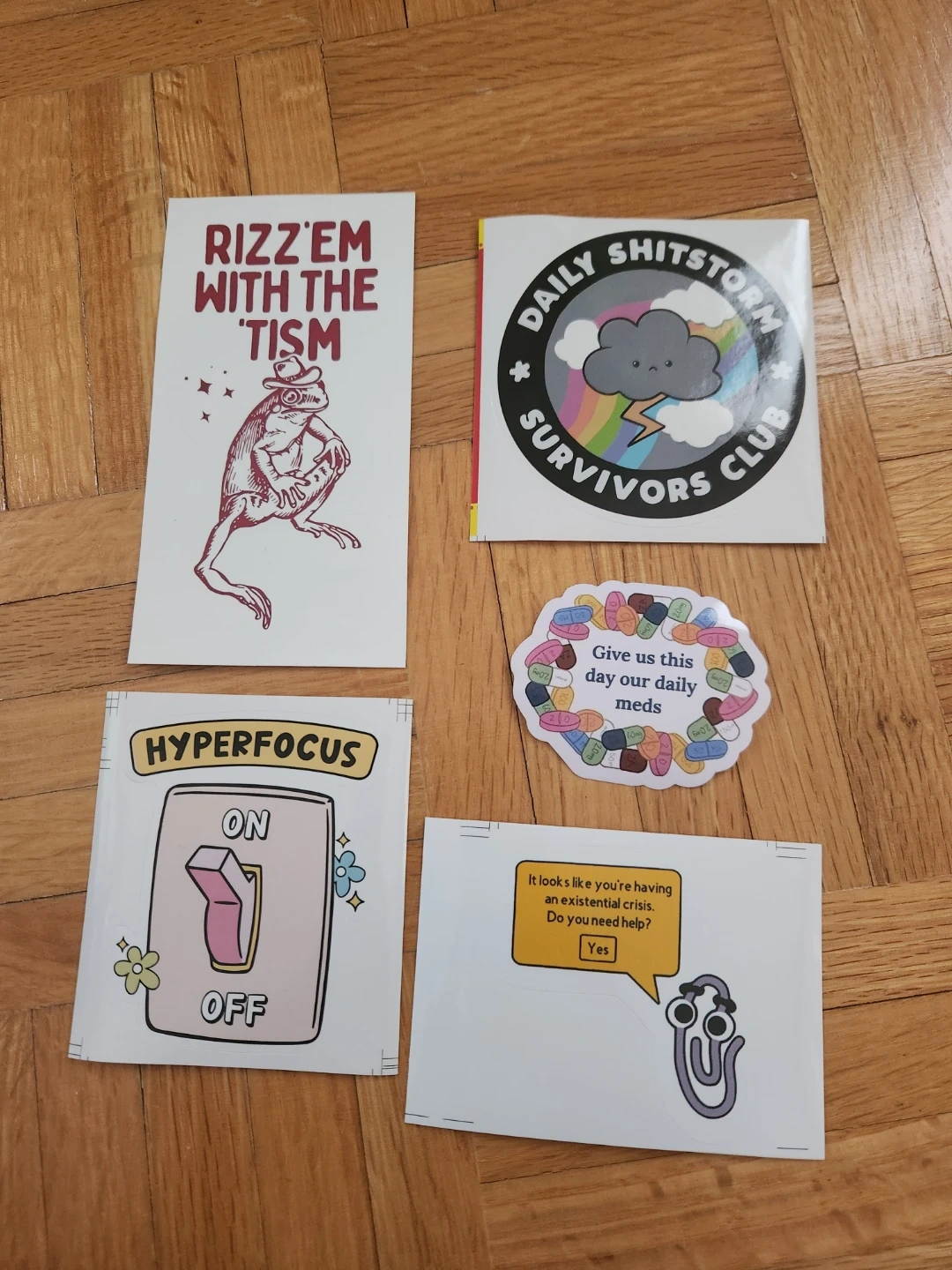A fun pack of stickers featuring witty and relatable designs. It's great for decorating laptops, notebooks, or water bottles. The stickers include "Rizz'em with the 'Tism," "Daily Shitstorm Survivors Club," "Hyperfocus ON/OFF," a pill-themed design, and a paperclip with an existential crisis quote. Add some personality to your gear!