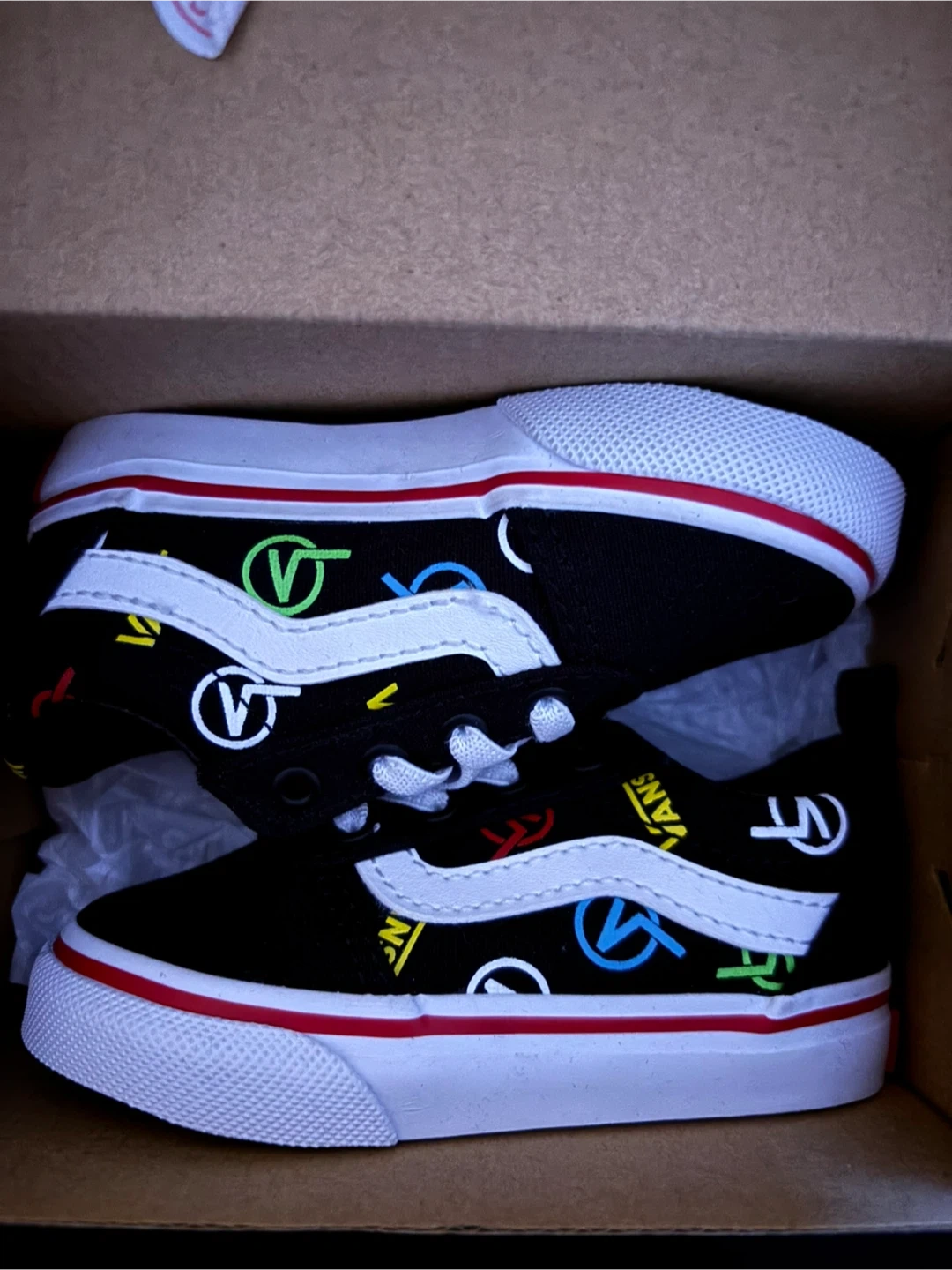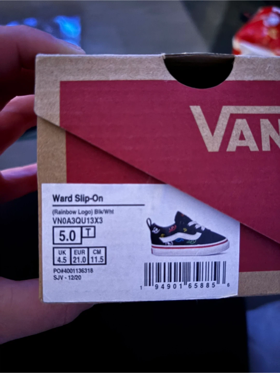 These are a brand new pair of Vans Ward Slip-On sneakers in size 5T! They feature a fun rainbow logo design on a black and white base. The original box is included.