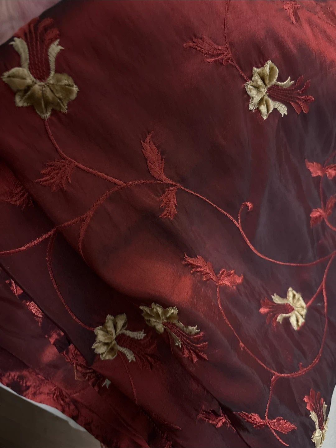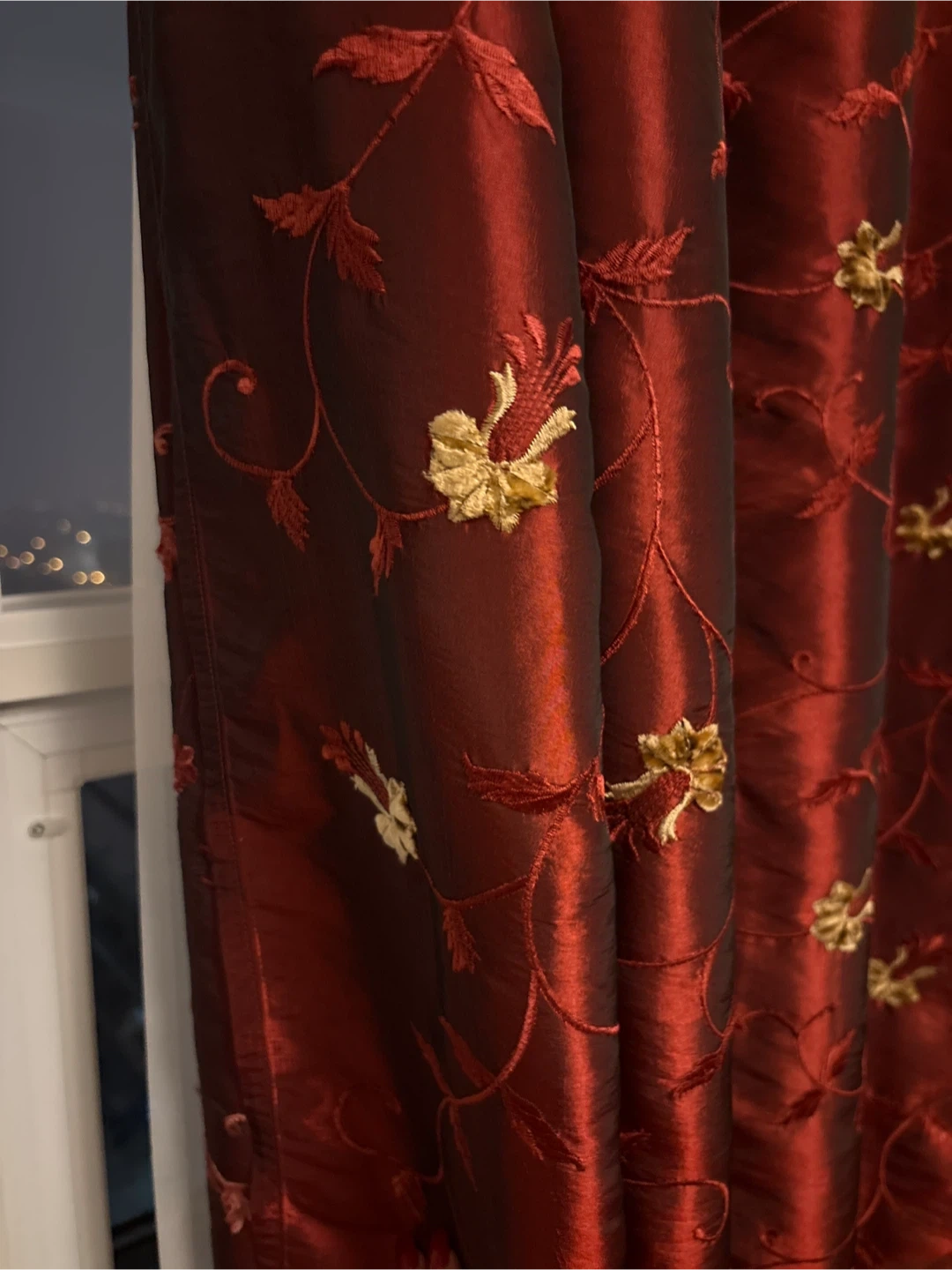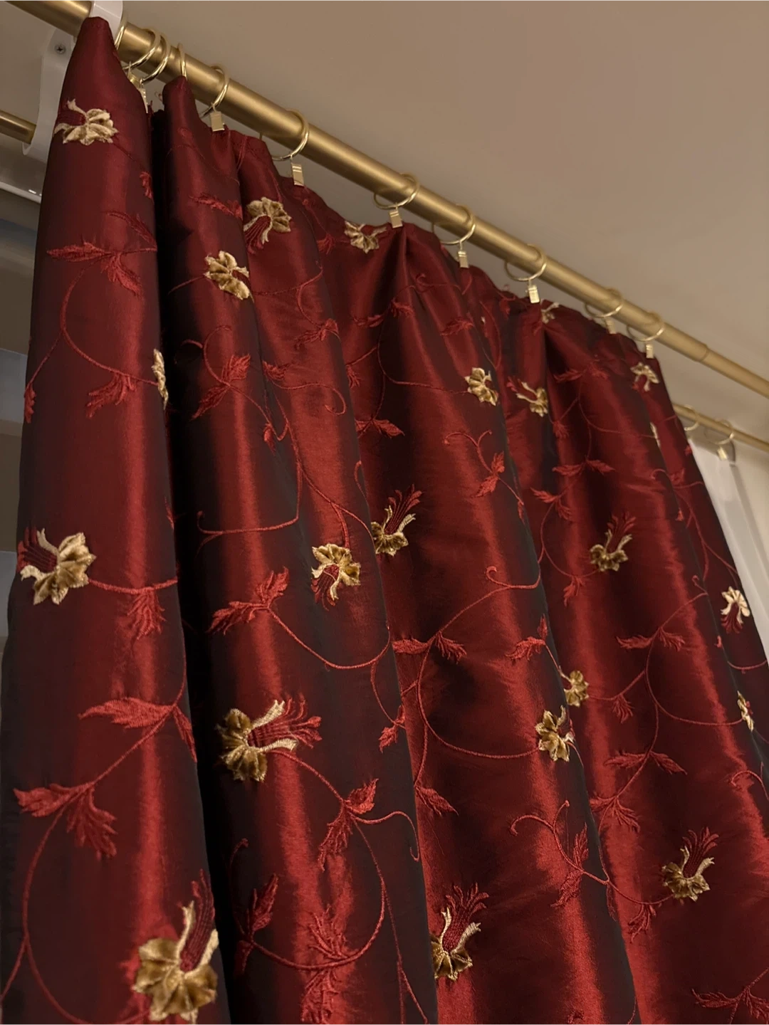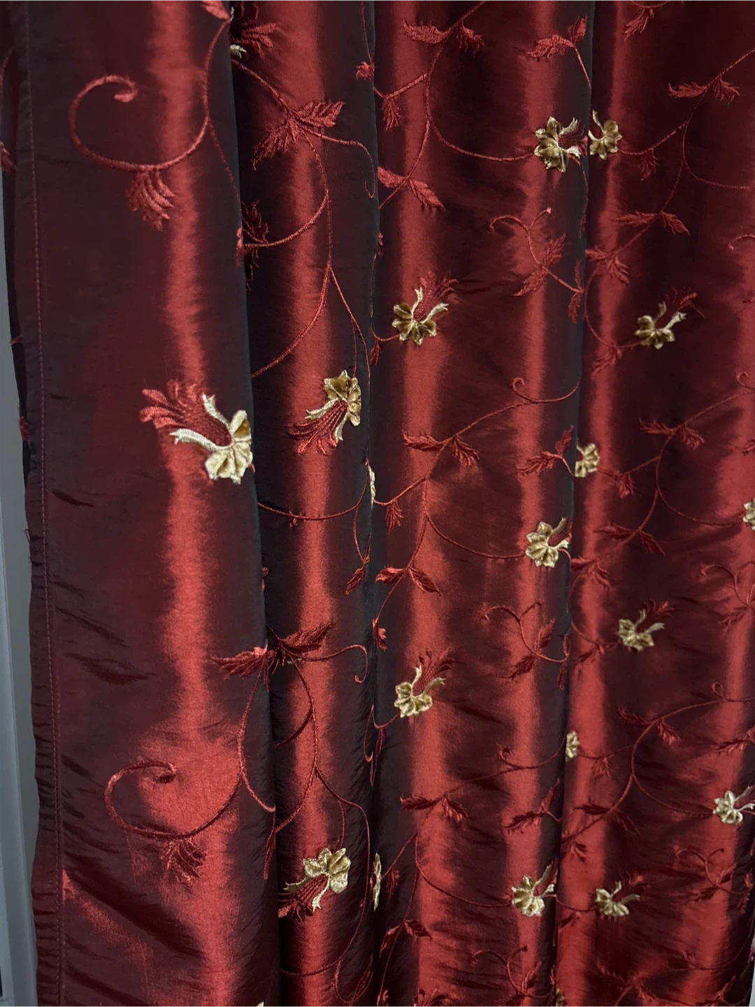 Beautiful burgundy curtain panel with gold embroidery and luxurious sheen! It would add a touch of elegance to any room. The material has a nice sheen and the embroidery is detailed and eye-catching. 57” wide x 92” long Pick up in Etobicoke