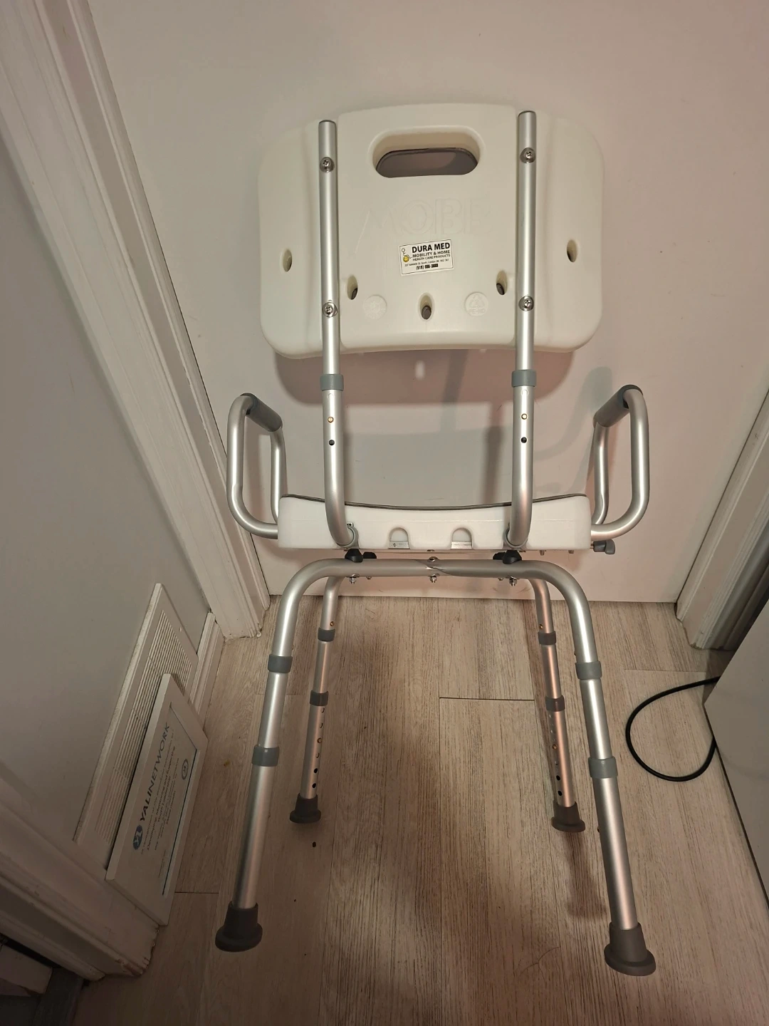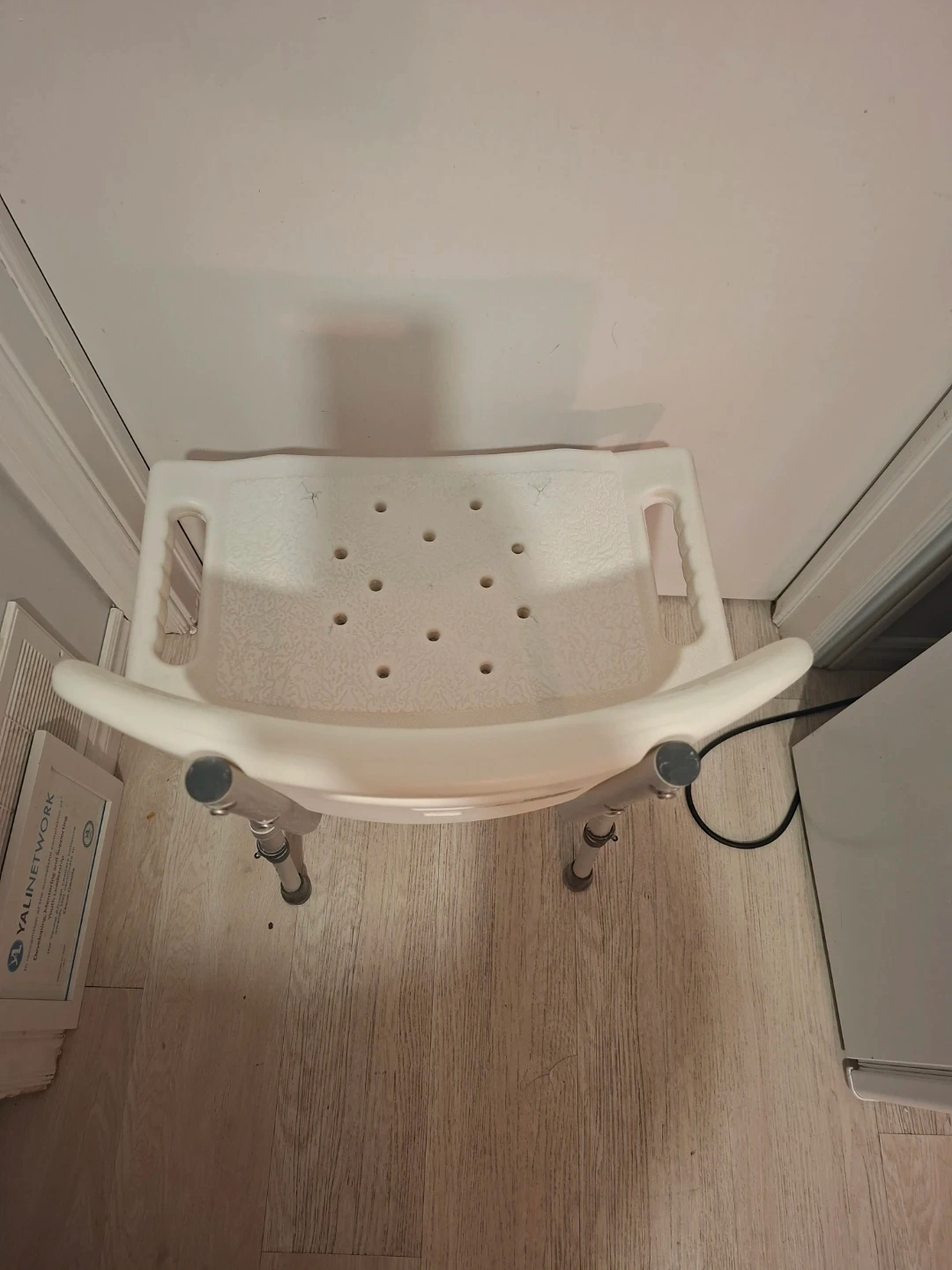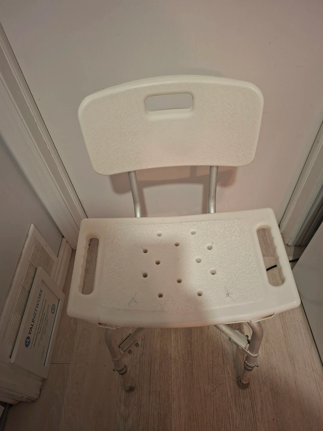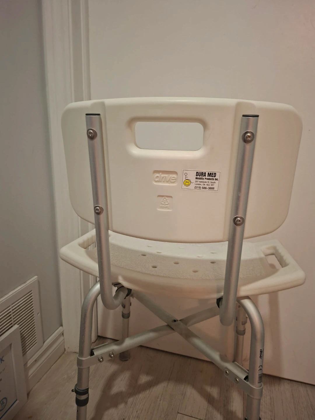 This shower chair by Drive Medical provides support and stability in the shower. It's made of durable plastic and aluminum. The seat features drainage holes and non-slip rubber tips on the legs.