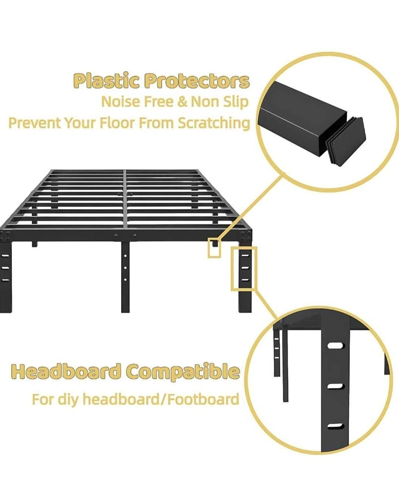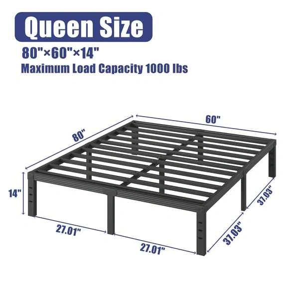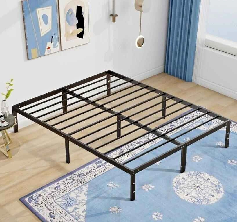 Sturdy queen size bed frame made of black metal with a 1000 lbs maximum load capacity. Noise-free design with plastic floor protectors. Compatible with DIY headboards or footboards. Platform style frame does not require a box spring. Estimated dimensions: 60" W x 80" D x 14" H. In original box. Original price $160.