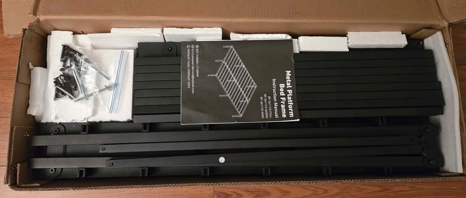 Sturdy queen size bed frame made of black metal with a 1000 lbs maximum load capacity. Noise-free design with plastic floor protectors. Compatible with DIY headboards or footboards. Platform style frame does not require a box spring. Estimated dimensions: 60" W x 80" D x 14" H. In original box. Original price $160.
