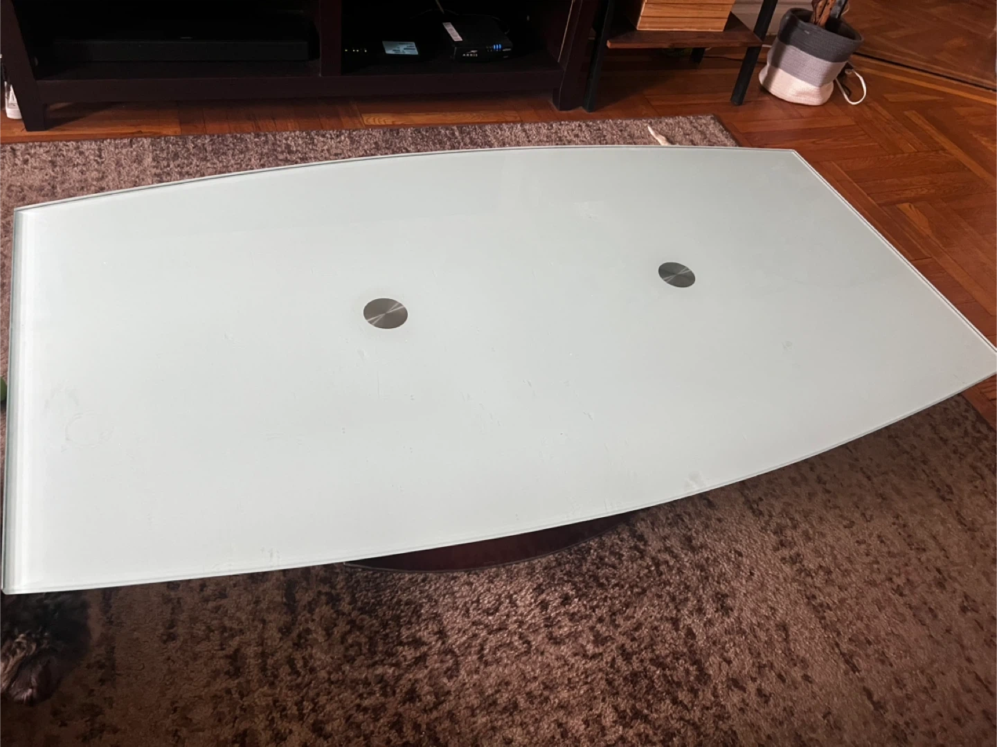 This contemporary coffee table features a frosted glass top and a curved wood base. It's spacious and provides a modern touch to any living room. Perfect for placing drinks or decor items.