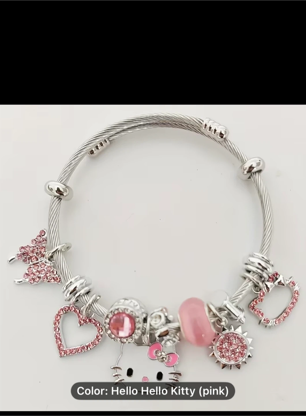This is a silver-toned bangle bracelet featuring Hello Kitty and various pink charms. It includes heart, butterfly, and sun designs, all adorned with pink rhinestones. It's a fun accessory for Hello Kitty fans!